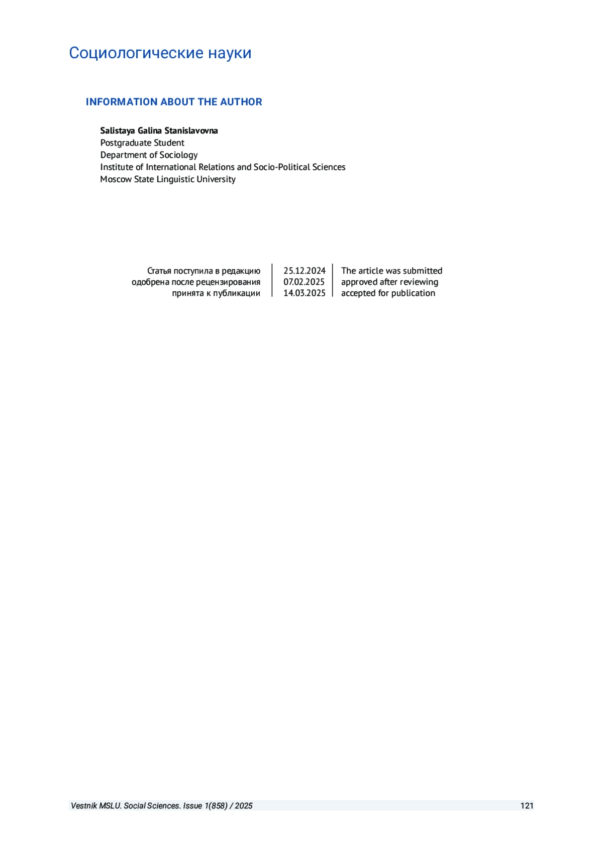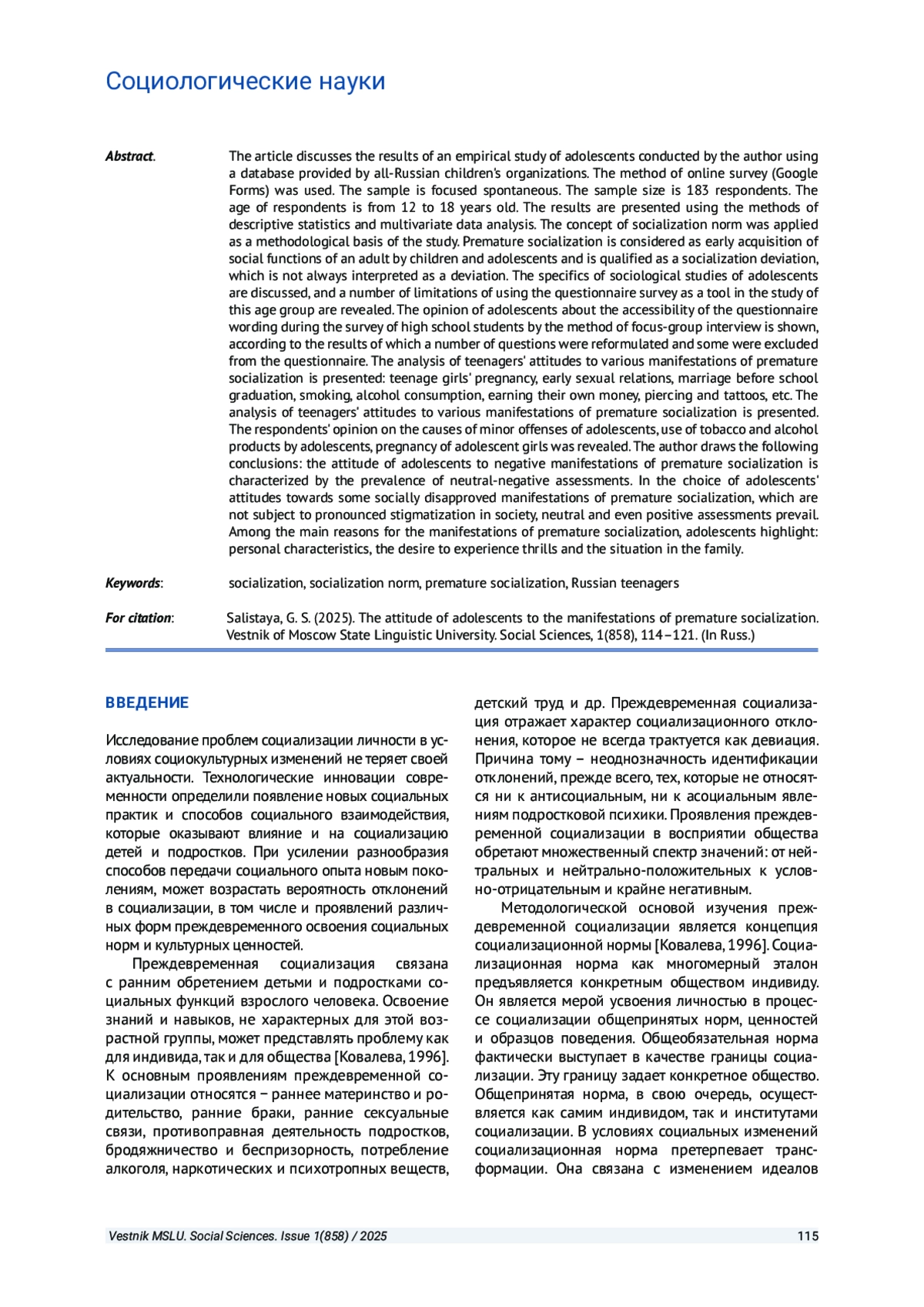 В статье рассматриваются результаты эмпирического исследования подростков, проведенного автором по базе данных, предоставленной общероссийскими детскими организациями. Использован метод онлайн-опроса (Google Forms). Выборка фокусированная стихийная. Объем выборки 183 респондента. Возраст респондентов от 12 до 18 лет. Результаты представлены с использованием методов описательной статистики и многомерного анализа данных. В качестве методологической базы исследования применена концепция социализационной нормы. Преждевременная социализация рассматривается как раннее обретение детьми и подростками социальных функций взрослого человека и представляет социализационное отклонение, которое не всегда трактуется как девиация. Обсуждена специфика социологических исследований подростков, выявлен ряд ограничений применения анкетного опроса в качестве инструментария при исследовании этой возрастной группы. Показано мнение подростков о доступности формулировок анкеты при проведении опроса старшеклассников методом фокус-группового интервью, по итогам которого ряд вопросов были переформулированы, а некоторые и вовсе исключены из анкеты. Представлен анализ отношения подростков к различным проявлениям преждевременной социализации: беременности девочек-подростков, ранним сексуальным связям, вступлению в брак до окончания школы, курению, употреблению алкогольной продукции, зарабатыванию собственных денег, пирсингу и татуировкам и др. Выявлено мнение респондентов о причинах мелких правонарушений подростков, употребления табака и алкогольной продукции подростками, беременности девочек-подростков. Автор делает следующие выводы: отношение подростков к негативным проявлениям преждевременной социализации характеризуется преобладанием нейтрально-негативных оценок. В выборе отношения подростков к некоторым социально неодобряемым проявлениям преждевременной социализации, которые не подвергаются выраженной стигматизации в обществе, - преобладают нейтральные и даже позитивные оценки. Среди основных причин проявлений преждевременной социализации подростки выделяют: личностные особенности, желание испытать острые ощущения и проблемную ситуацию в семье.