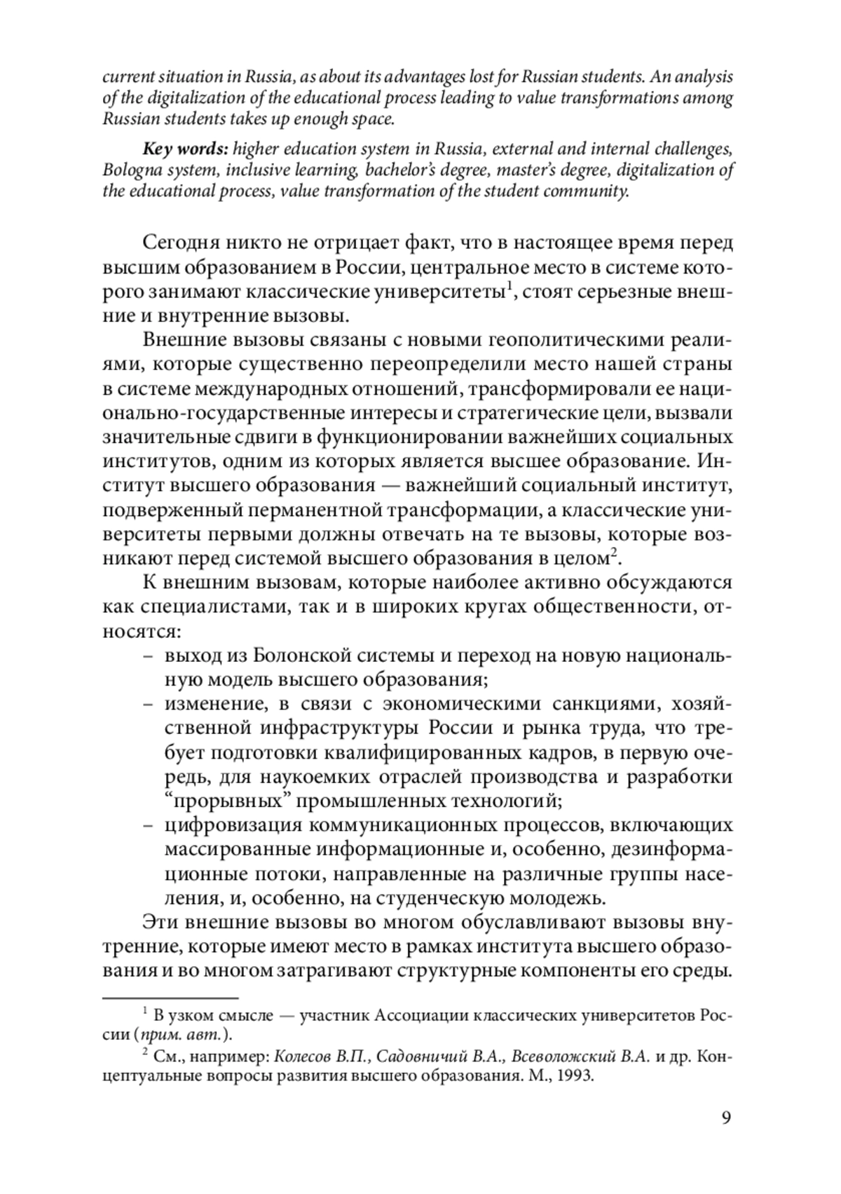 Внешние вызовы связаны с новыми геополитическими реалиями, которые существенно переопределили место нашей страны в системе международных отношений, трансформировали её национально-государственные интересы и стратегические цели, вызвали значительные сдвиги в функционировании важнейших социальных институтов, одним из которых является высшее образование. Институт высшего образования – важнейший социальный институт, подверженный перманентной трансформации, а классические университеты – первыми должны отвечать на те вызовы, которые возникают перед системой высшего образования в целом.