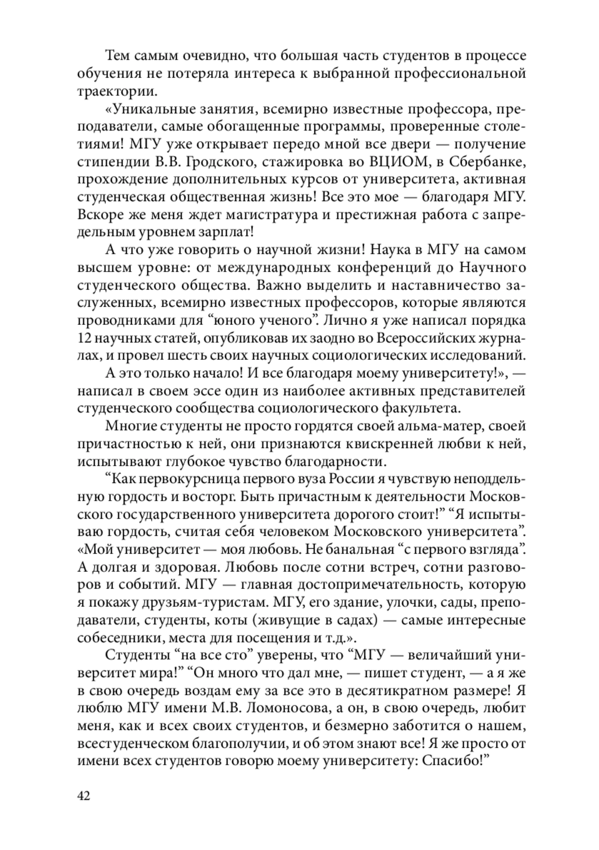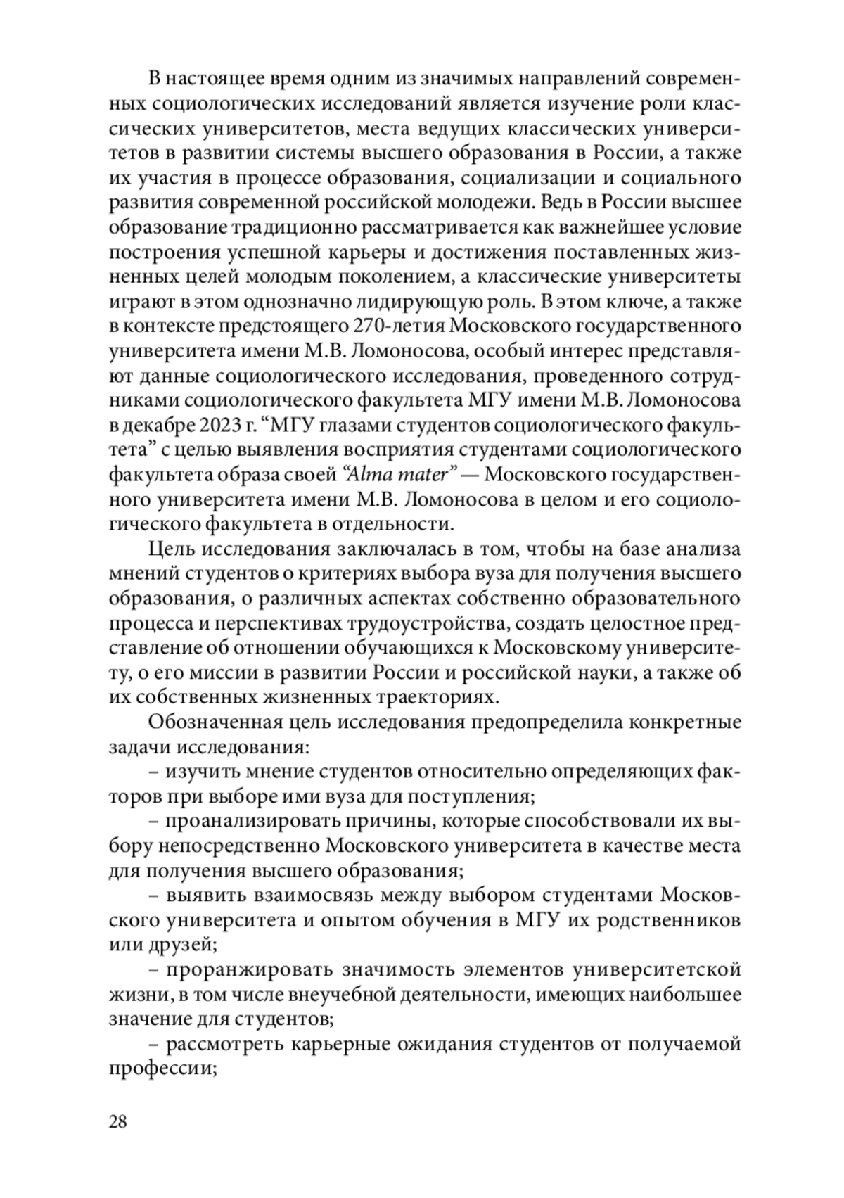 Данная статья подготовлена коллективом авторов социологического факультета МГУ имени М. В. Ломоносова в рамках подготовки к 270-летию Московского университета. В основу статьи легли обработанные и проанализированные данные социологического исследования “МГУ глазами студентов социологического факультета”, проведённого сотрудниками социологического факультета МГУ имени М. В. Ломоносова в декабре 2023 года. В рамках исследования опрошено в общей сложности 679 студентов. В дополнение к количественной составляющей, важной частью исследования стал анализ эссе студентов, в которых они описывали свои впечатления от поступления и обучения в МГУ. Цель исследования заключалась в том, чтобы на базе анализа мнений студентов о критериях выбора вуза для получения высшего образования, о различных аспектах собственно образовательного процесса и перспективах трудоустройства, создать целостное представление об отношении обучающихся к Московскому университету, о его миссии в развитии России и российской науки, а также об их собственных жизненных траекториях. В рамках исследования было изучено мнение студентов относительно определяющих факторов при выборе ими вуза для поступления, проанализированы причины, которые способствовали их выбору непосредственно Московского университета в качестве места для получения высшего образования. Была показана взаимосвязь между выбором студентами Московского университета и опытом обучения в МГУ их родственников или друзей, проранжирована значимость элементов университетской жизни, в том числе внеучебной деятельности, имеющих наибольшее значение для студентов. Отдельно в статье были рассмотрены вопросы, связанные с трудоустройством выпускников и ожиданиями от будущей профессии.