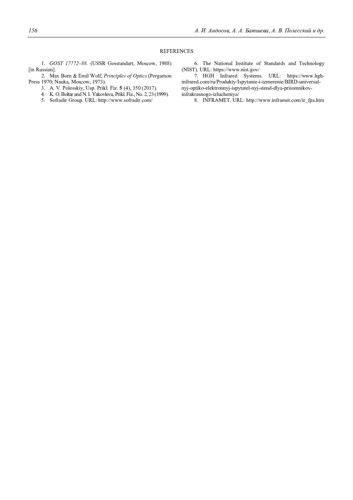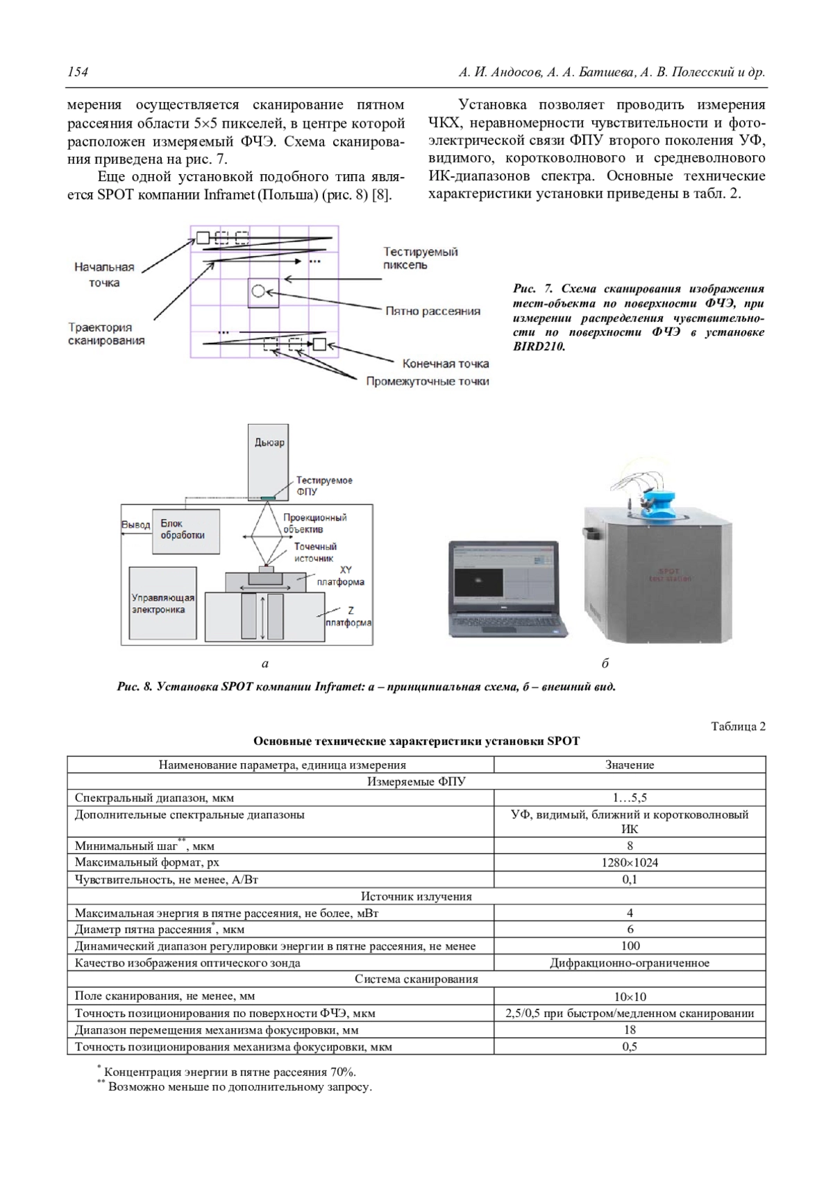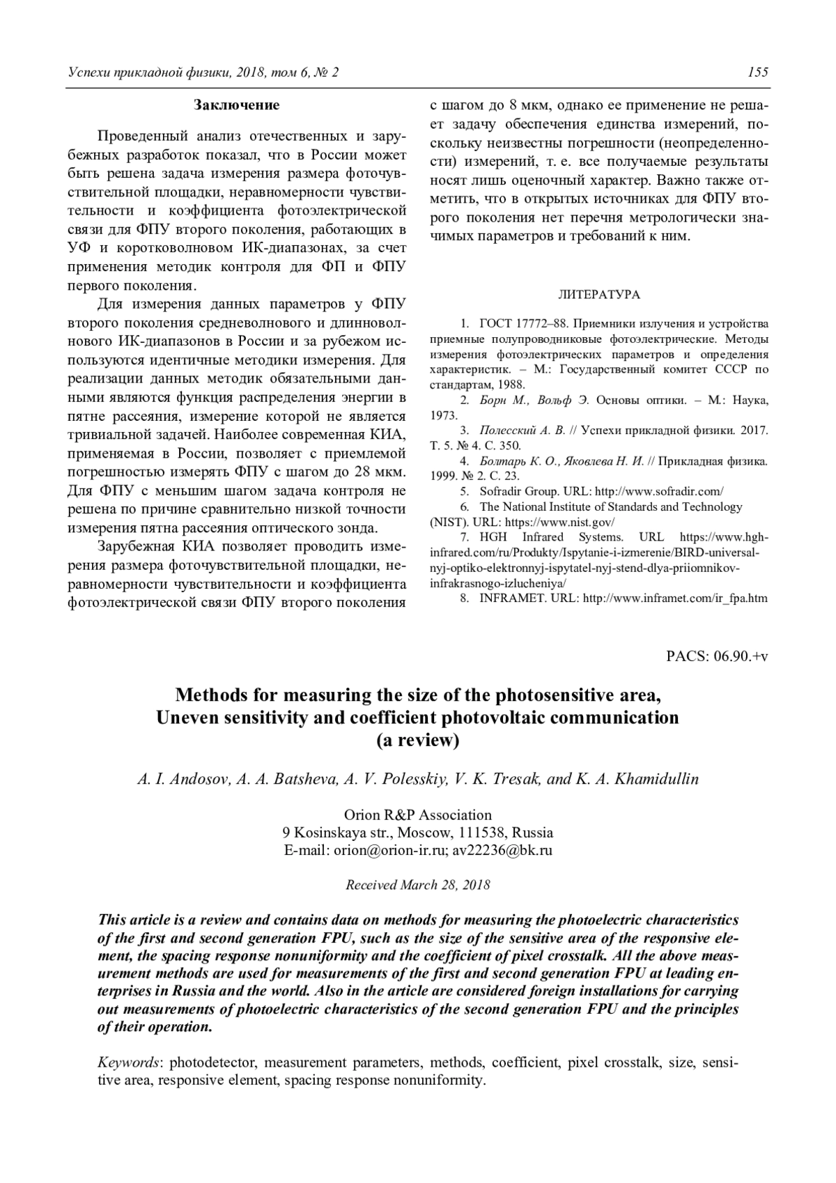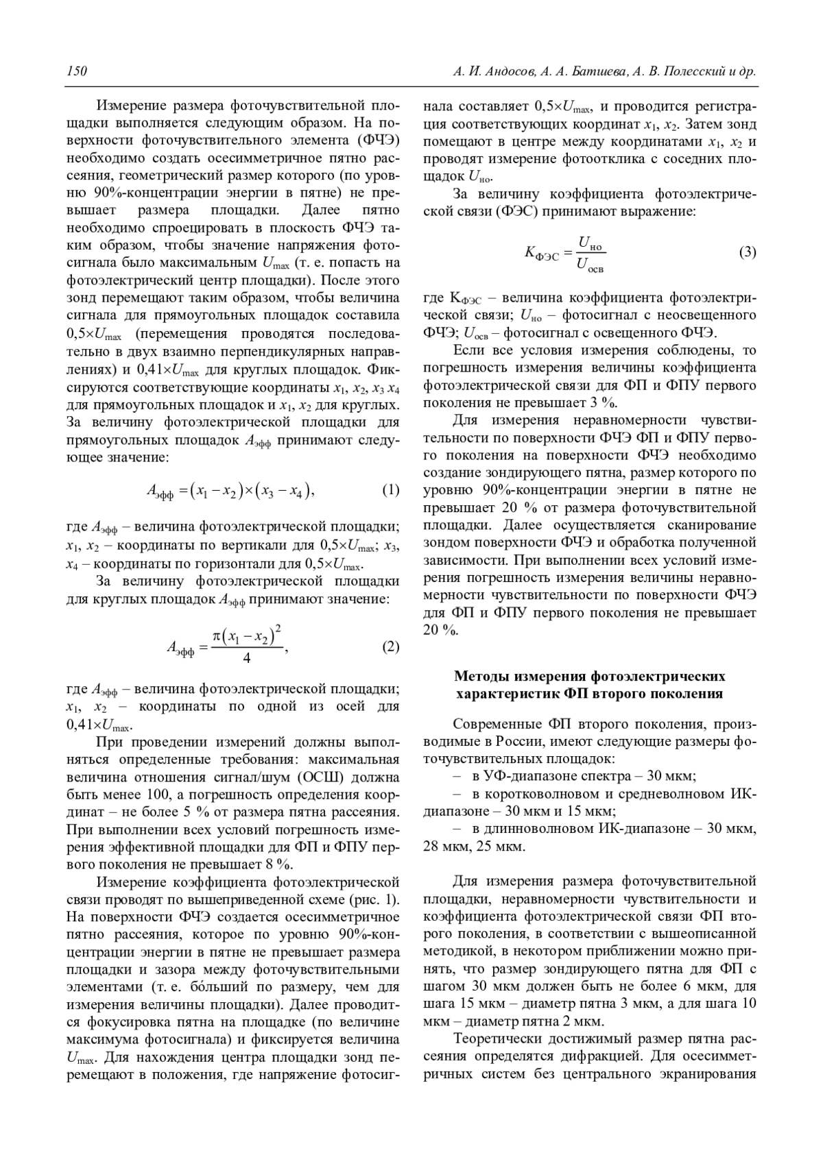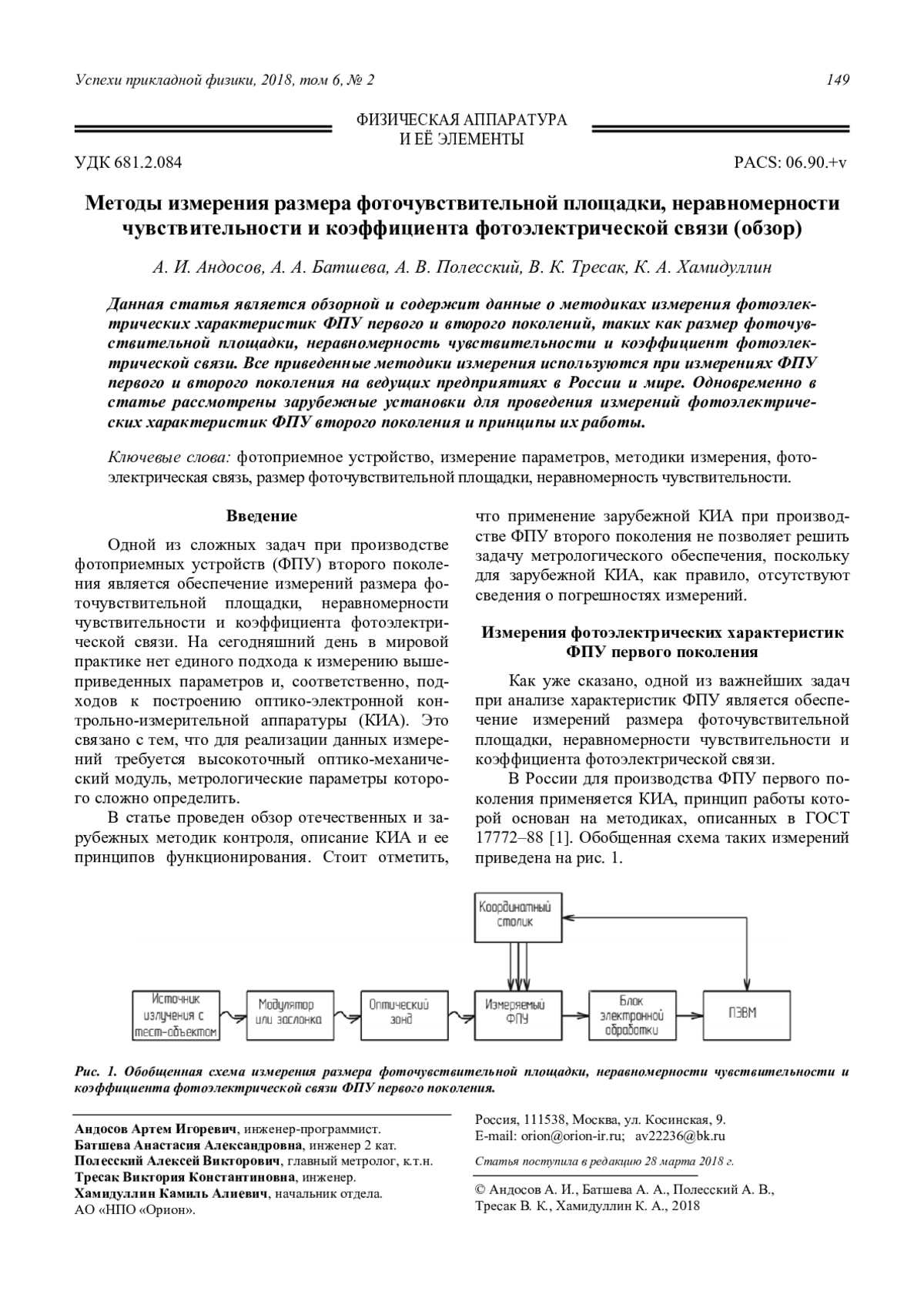 Андосов А. И., Батшева А. А., Полесский А. В., Тресак В. К., Хамидуллин К. А. Методы измерения размера фоточувствительной площадки, неравномерности чувствительности и коэффициента фото-электрической связи (обзор) 149