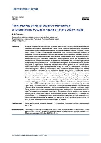 В начале 2020-х годов между Россией и Индией наблюдалось снижение торговых связей в сфере военно-технического сотрудничества. Данная статья содержит анализ влияния политических процессов на динамику военно-технического сотрудничества между Россией и Индией в начале 2020-х годов. В статье рассматриваются как внешние, так и внутренние факторы, влияющие на оборонное сотрудничество между означенными странами. Особое внимание уделяется изменениям в военно-политической обстановке, сложившейся вокруг Индии, а также внутриполитическим тенденциям, таким как стремление к автономии и хеджированию рисков для собственной оборонной отрасли. Для достижения цели исследования используется неоклассический реализм как основная теоретическая парадигма. Она позволяет анализировать внешнеполитические действия государств на пересечении системного и внутриполитического уровней. В статье также практикуется оборонительный реализм в трактовке К. Уолтца и С. Уолта. Он способствует анализу соотношения материальных потенциалов и оценки угроз. Основным методом исследования является анализ заявлений официальных лиц, статистики поставок вооружений. Он позволяет взаимно соотнести количественные и качественные показатели. Результаты исследования показывают, что снижение военно-технического сотрудничества между Россией и Индией обусловлено рядом факторов системного и конъюнктурного характера. Нарастание индийско-китайских и индийско-пакистанских противоречий сопутствует недоверию к российско-китайскому сближению, ускоряя процесс переориентации Индии на западные страны. Данная тенденция совмещается с начатыми в Индии в 2010-х годах долгосрочными программами развития национального производства, а также стремлением снизить уязвимость страны от возможных санкций за сотрудничество с Россией. Итак, в российско-индийских отношениях наблюдаются кризисные тенденции. Однако Россия и Индия продолжают рассматривать друг друга как долгосрочных партнеров в сфере обороны. Сотрудничество двух стран осуществляется благодаря их общим стратегическим интересам и долгосрочным совместным проектам, нацеленным на создание полицентрического порядка. Следует добавить, что в Индии наличествует значительная доля российского военно-промышленного комплекса. Причем экспорт высокотехнологических товаров из России в Индию возрастает со времени возникновения геополитического конфликта на Украине.