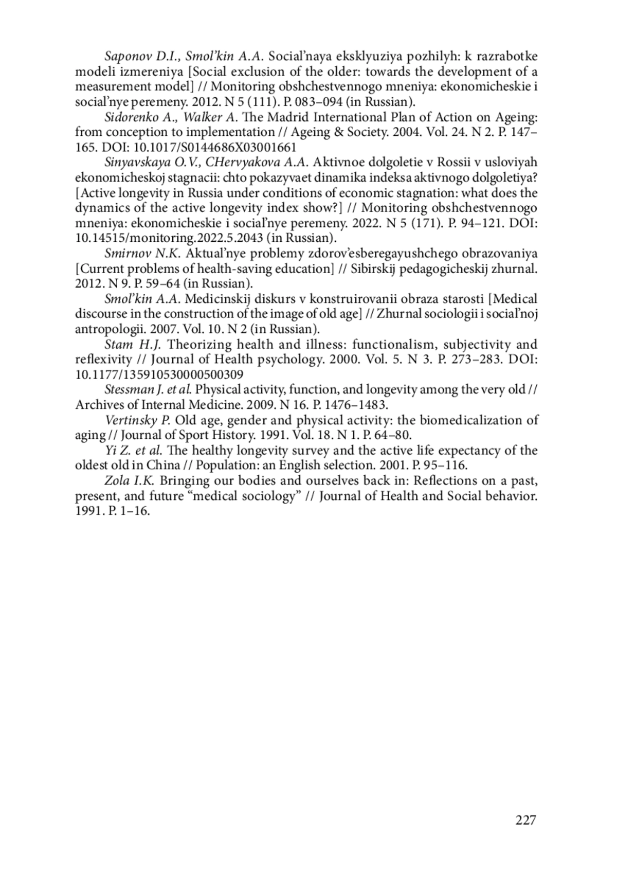 6. Михалева А.В. Влияние медикализации на здоровье пожилых людей // Вестник Санкт-Петербургского университета. Социология. 2009. №. 2-1. С. 130-140.