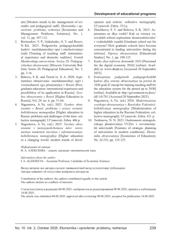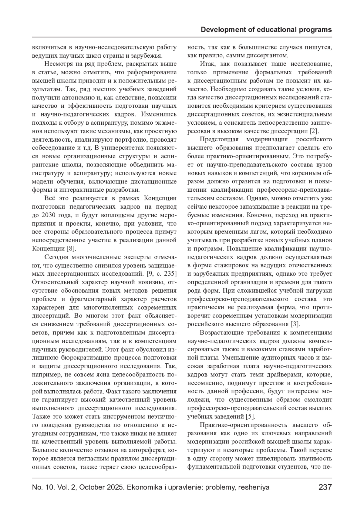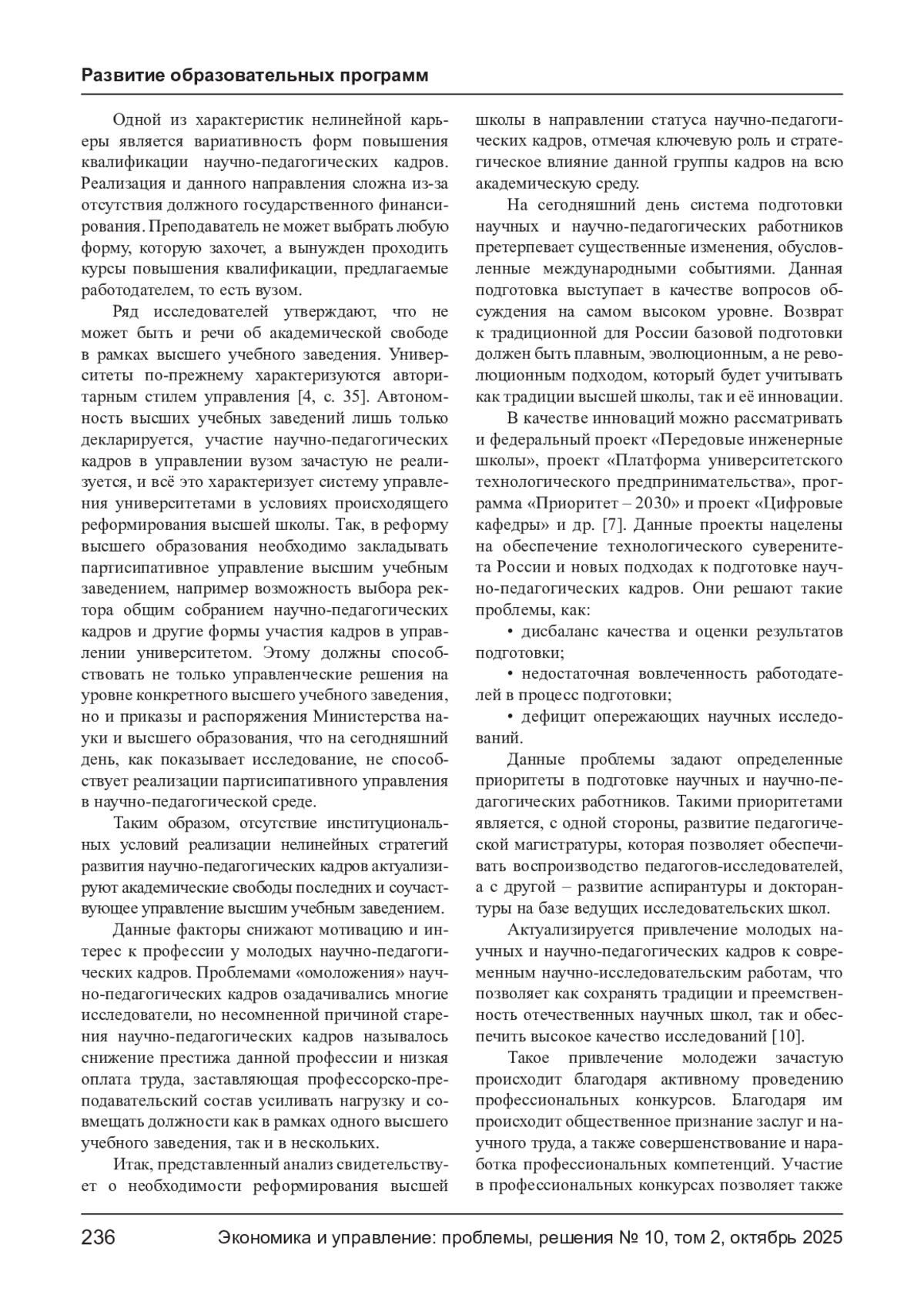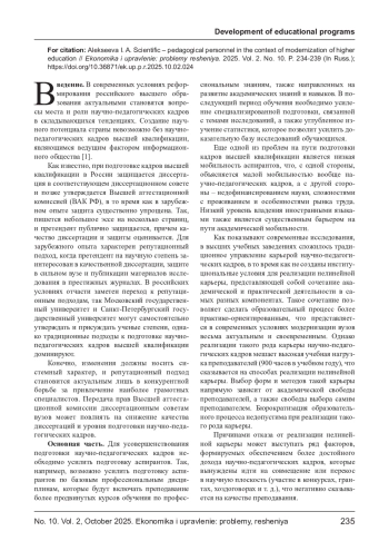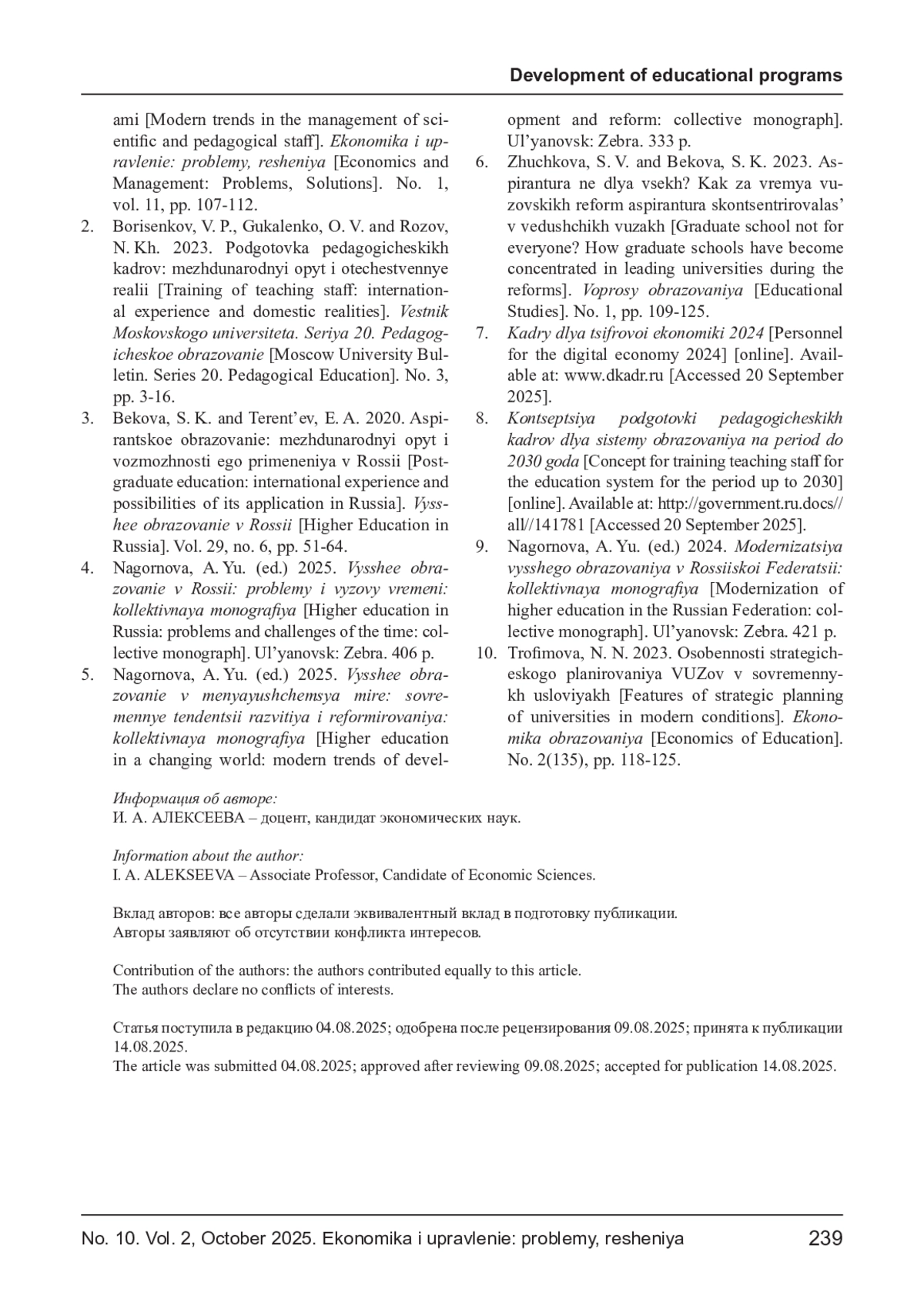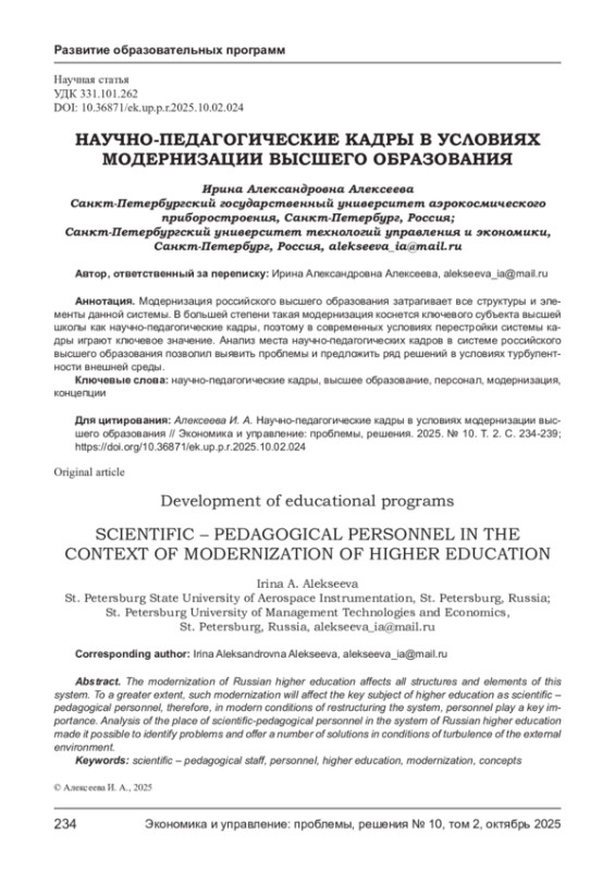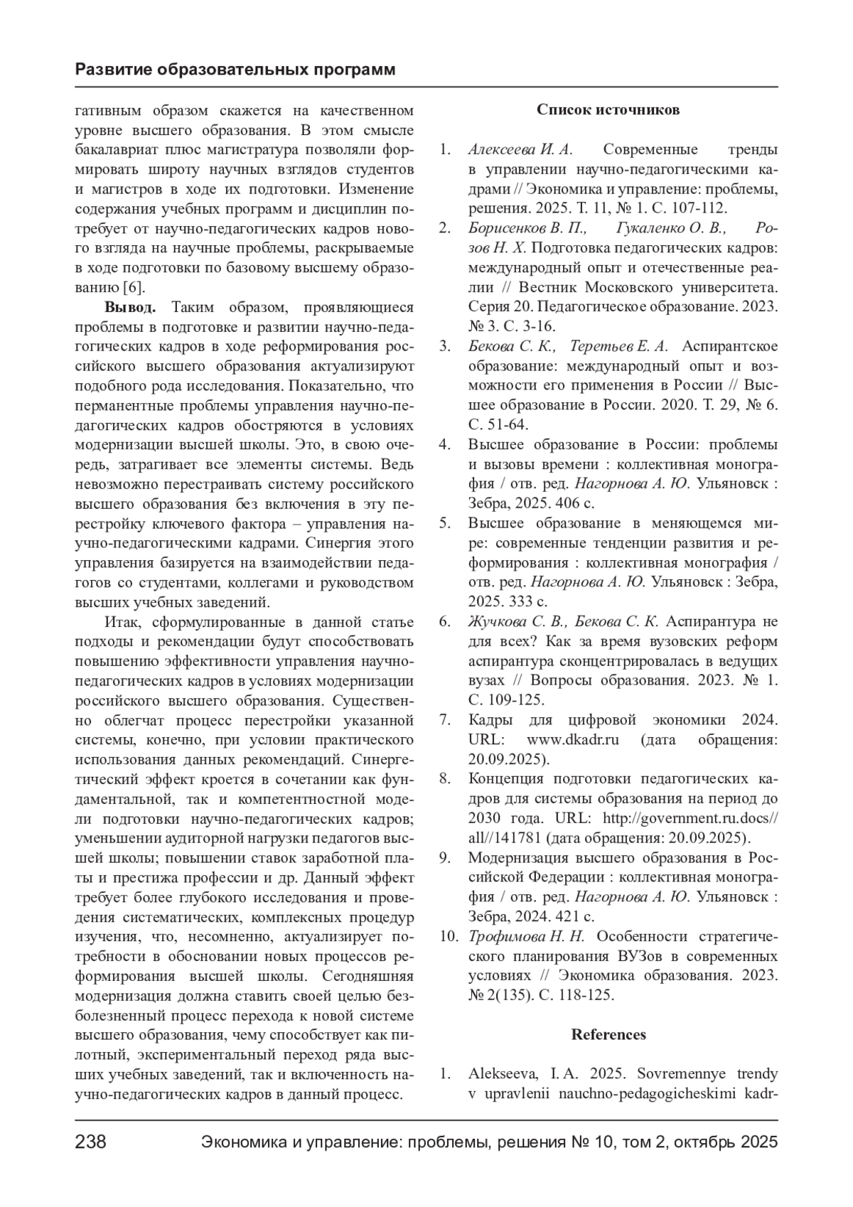АЛЕКСЕЕВА И. А. НАУЧНО-ПЕДАГОГИЧЕСКИЕ КАДРЫ В УСЛОВИЯХ МОДЕРНИЗАЦИИ ВЫСШЕГО ОБРАЗОВАНИЯ // ЭКОНОМИКА И УПРАВЛЕНИЕ: ПРОБЛЕМЫ, РЕШЕНИЯ. 2025. ТОМ 2 № 10