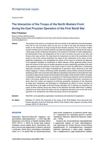 Цель исследования - дать характеристику деятельности руководства Северо-Западным фронтом 1-й и 2-й Армий, входящих в его состав. Корпусам дивизий этих армий была доверена координация войск в ходе ведения Восточно-Прусской операции. В статье применяются историко-системный и историко-типологический методы исследования. Они отвечают современным требованиям к историческим исследованиям. Использование этих методов позволило провести исследование достаточно большого количества исторических документов Ставки Верховного главнокомандующего, Северо-Западного фронта, штабов 1-й и 2-й армий и некоторых корпусов дивизий, входящих в их состав. Приводятся примеры согласования усилий между различными органами управления, армиями, корпусами и дивизиями в ходе ведения боевых действий последовательно по дням операции и направлениям действий войск. Отмечаются сложности в поддержании взаимодействия войск на различных этапах проведения боевых операций. Сложности возникают при выдвижении к государственной границе, завязке боя, ведении боевых действий, выходе из боя, выходе из окружения, отходе на другие рубежи, переходе к ведению оборонительных действий. Рассматриваются документы, позволяющие определить порядок действий командующих (командиров, начальников), их штабов на всех этапах ведения боевых операций. На основании рассмотренных исторических и аналитических документов делаются выводы о содержании, последовательности достижения устойчивого взаимодействия войск, об их составных частях и приемах по согласованию усилий различных родов войск на всех этапах ведения Восточно-Прусской операции, а при необходимости и восстановления взаимодействия; определяются причины нарушений в ходе ведения операции. Кроме того, делаются выводы о влиянии и роли организованного взаимодействия до начала операции на его поддержание и восстановление в ходе ведения.