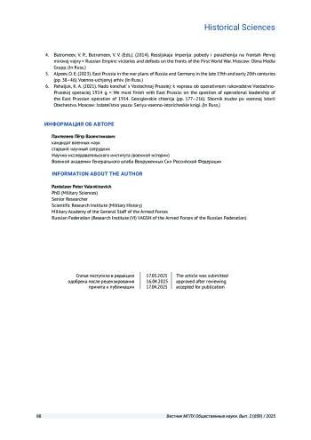 6. Пахалюк К. А. Надо кончать с Восточной Пруссией: к вопросу об оперативном руководстве Восточно-Прусской операцией 1914 года // Георгиевские чтения: сборник трудов по военной истории Отечества. М.: Яуза, 2021. С. 177-216. (Серия: Военно-исторические книги).
