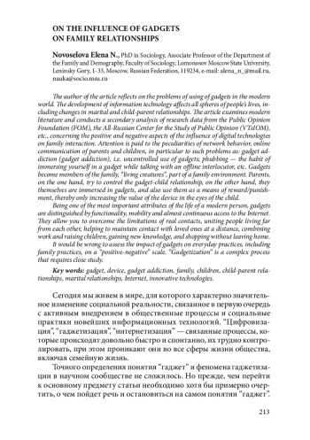 Автор статьи размышляет о проблемах и перспективах широкого распространения гаджетов в современном цифровом мире. Развитие информационных технологий затрагивает все сферы жизни людей, в том числе вносит изменения в супружеские и детско-родительские отношения. В статье рассматривается современная литература и проводится вторичный анализ данных исследований Фонда общественное мнение (ФОМ), Всероссийского центра изучения общественного мнения (ВЦИОМ) и др., касающихся позитивных и негативных аспектов влияния цифровых технологий на семейное взаимодействие. Уделяется внимание особенностям сетевого поведения, онлайн общения как родителей, так и детей, в частности таким проблемам как: гаджетозависимость (гаджет-аддикция), т. е. неконтролируемое пользование гаджетами; фаббинг – привычка погружаться в гаджет во время разговора с оффлайн собеседником и т. д. Гаджеты становятся членами семьи, одушевляются и вписываются в привычный домашний ландшафт. Родители, с одной стороны, пытаются контролировать взаимоотношения гаджет-ребенок, с другой – сами погружены в гаджеты, а также используют их как средство поощрения/наказания, тем самым только повышая ценность девайся в глазах ребенка.