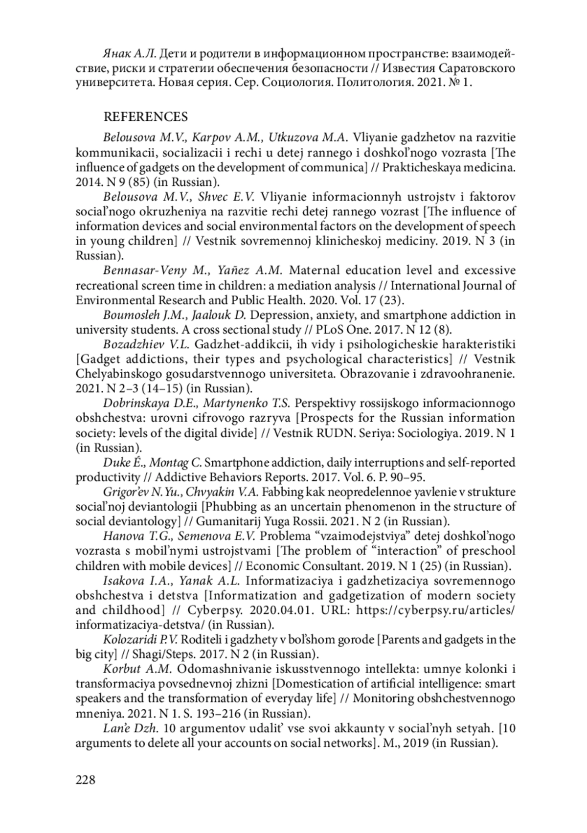 7. Исакова И.А., Янак А.Л. Информатизация и гаджетизация современного общества и детства // Cyberpsy. 2020.04.01. URL: https://cyberpsy.ru/articles/informatizaciya-detstva