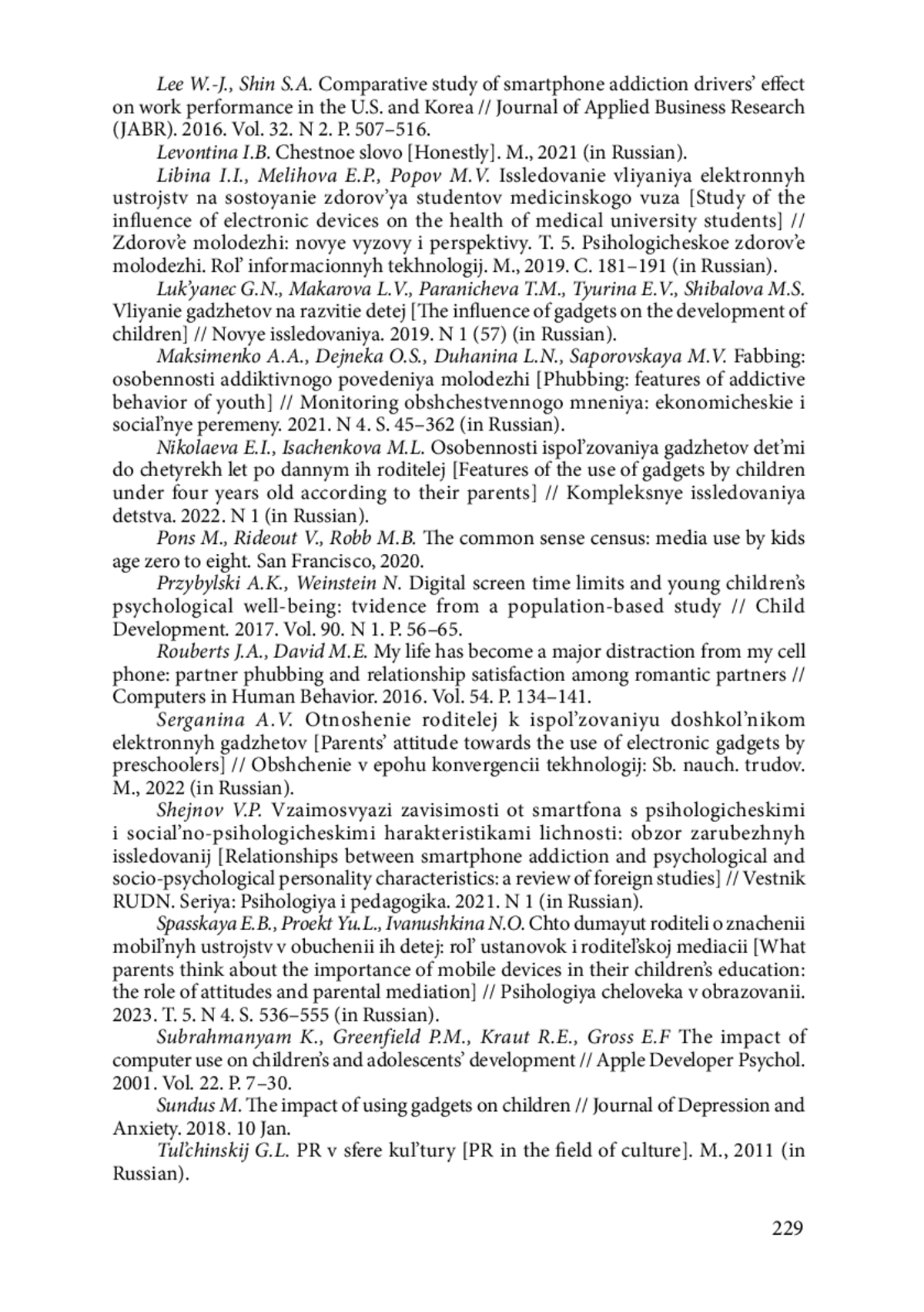 14. Максименко А.А., Дейнека О.С., Духанина Л.Н., Сапоровская М.В. Фаббинг: особенности аддиктивного поведения молодежи // Мониторинг общественного мнения: экономические и социальные перемены. 2021. № 4. С. 45-362.