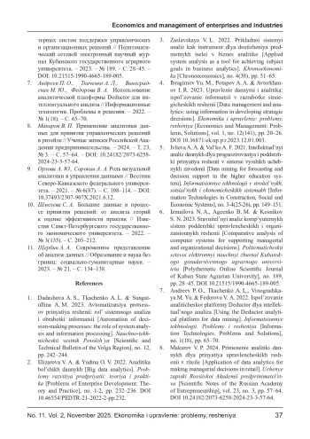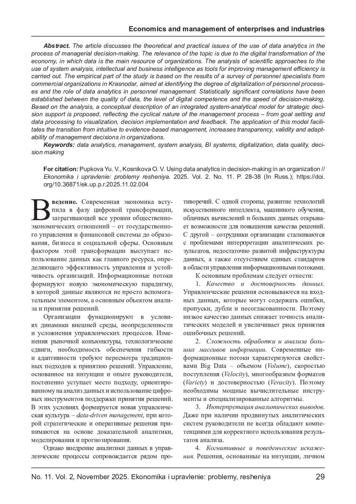 В статье рассматриваются теоретические и практические вопросы применения аналитики данных в процессе принятия управленческих решений. Актуальность темы обусловлена цифровой трансформацией экономики, в рамках которой данные являются главным ресурсом организаций. Проведен анализ научных подходов к использованию системного анализа, интеллектуальной и бизнес-аналитики как инструментов повышения эффективности управления. Эмпирическая часть исследования основана на результатах опроса кадровых специалистов коммерческих организаций города Краснодара, направленного на выявление степени цифровизации кадровых процессов и роли аналитики данных в управлении персоналом. Установлены статистически значимые корреляции между качеством данных, уровнем цифровой компетентности и оперативностью принятия решений. На основе анализа предложено концептуальное описание интегрированной системно-аналитической модели поддержки стратегических решений, отражающей циклический характер управленческого процесса - от постановки целей и обработки данных до визуализации, реализации решений и обратной связи. Применение данной модели способствует переходу от интуитивного управления к доказательному, повышает прозрачность, обоснованность и адаптивность управленческих решений в организациях.