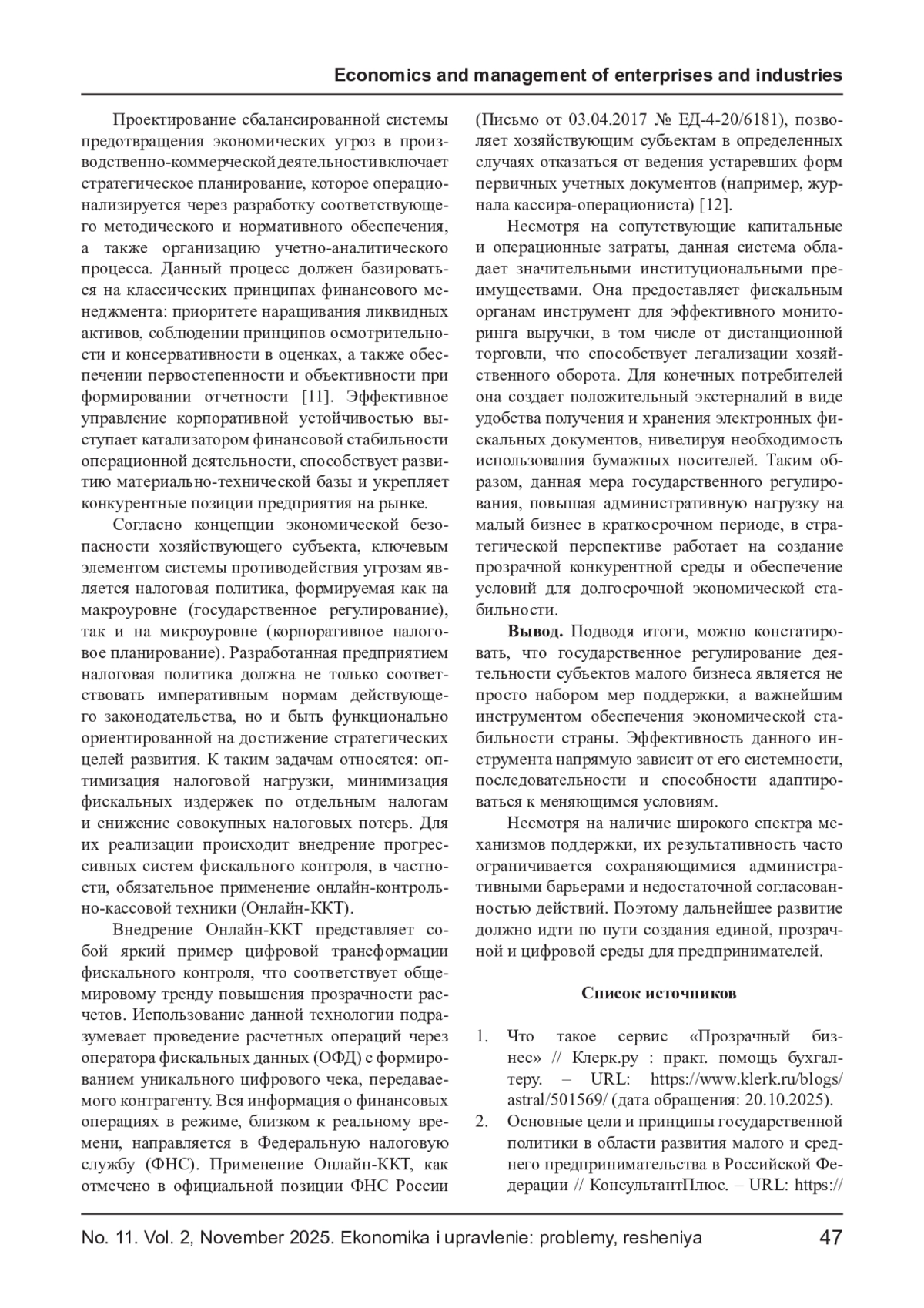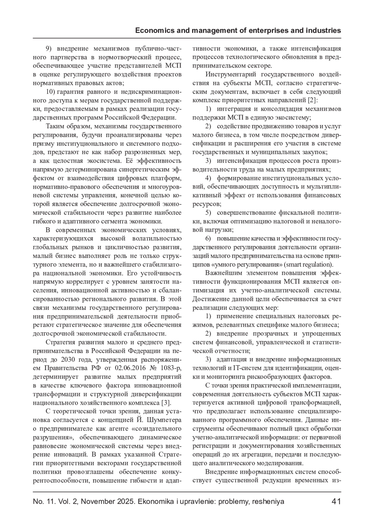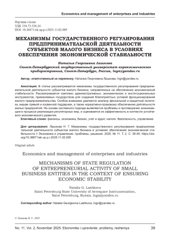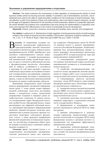 В статье рассматриваются механизмы государственного регулирования предпринимательской деятельности субъектов малого бизнеса, направленные на обеспечение экономической стабильности. Рассматривается комплекс административных, экономических и институциональных инструментов, применяемых государством для создания благоприятных условий функционирования малого предпринимательства. Особое внимание уделяется анализу фискальной и кредитной политики, мерам прямой и косвенной поддержки, а также нормативно-правовому обеспечению деятельности малых предприятий. На основе системного подхода выявляются проблемы и противоречия, возникающие в процессе реализации регуляторных мер, и оценивается их эффективность в контексте устойчивого экономического развития.