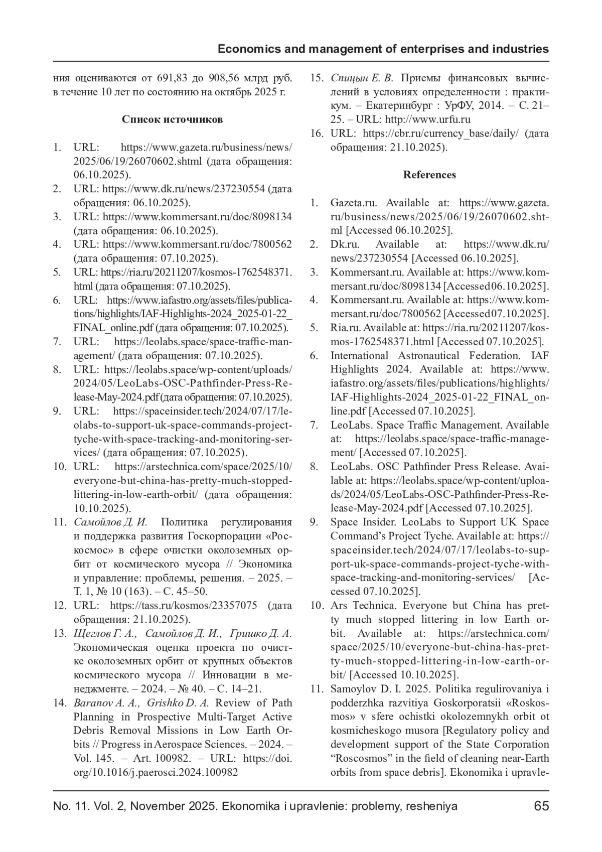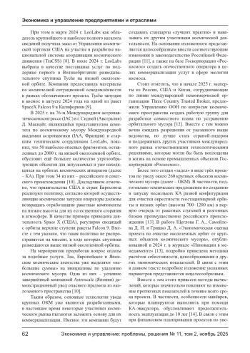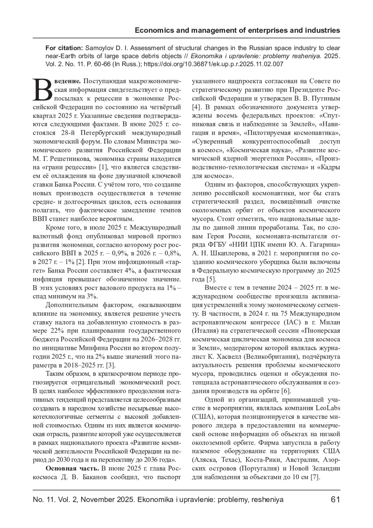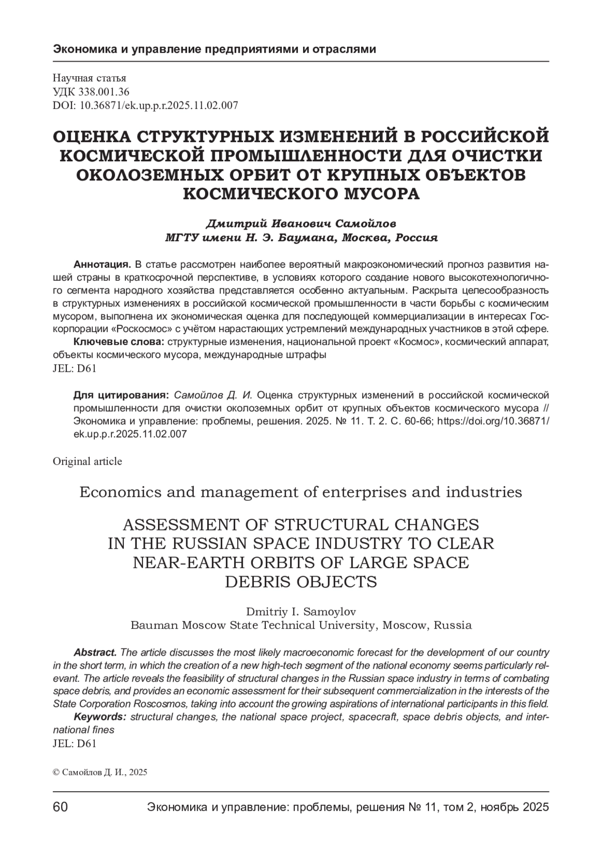 В статье рассмотрен наиболее вероятный макроэкономический прогноз развития нашей страны в краткосрочной перспективе, в условиях которого создание нового высокотехнологичного сегмента народного хозяйства представляется особенно актуальным. Раскрыта целесообразность в структурных изменениях в российской космической промышленности в части борьбы с космическим мусором, выполнена их экономическая оценка для последующей коммерциализации в интересах Госкорпорации «Роскосмос» с учётом нарастающих устремлений международных участников в этой сфере.