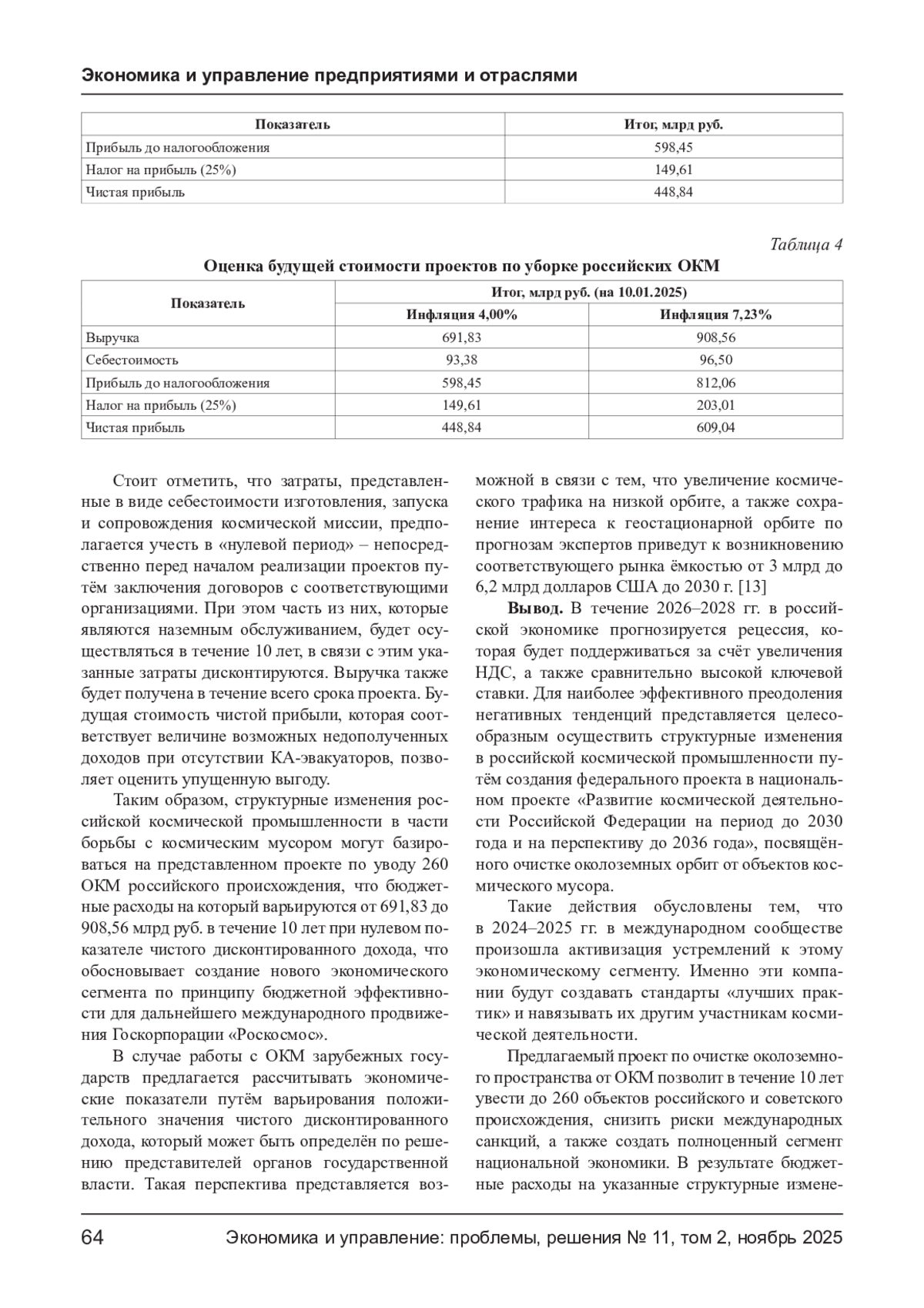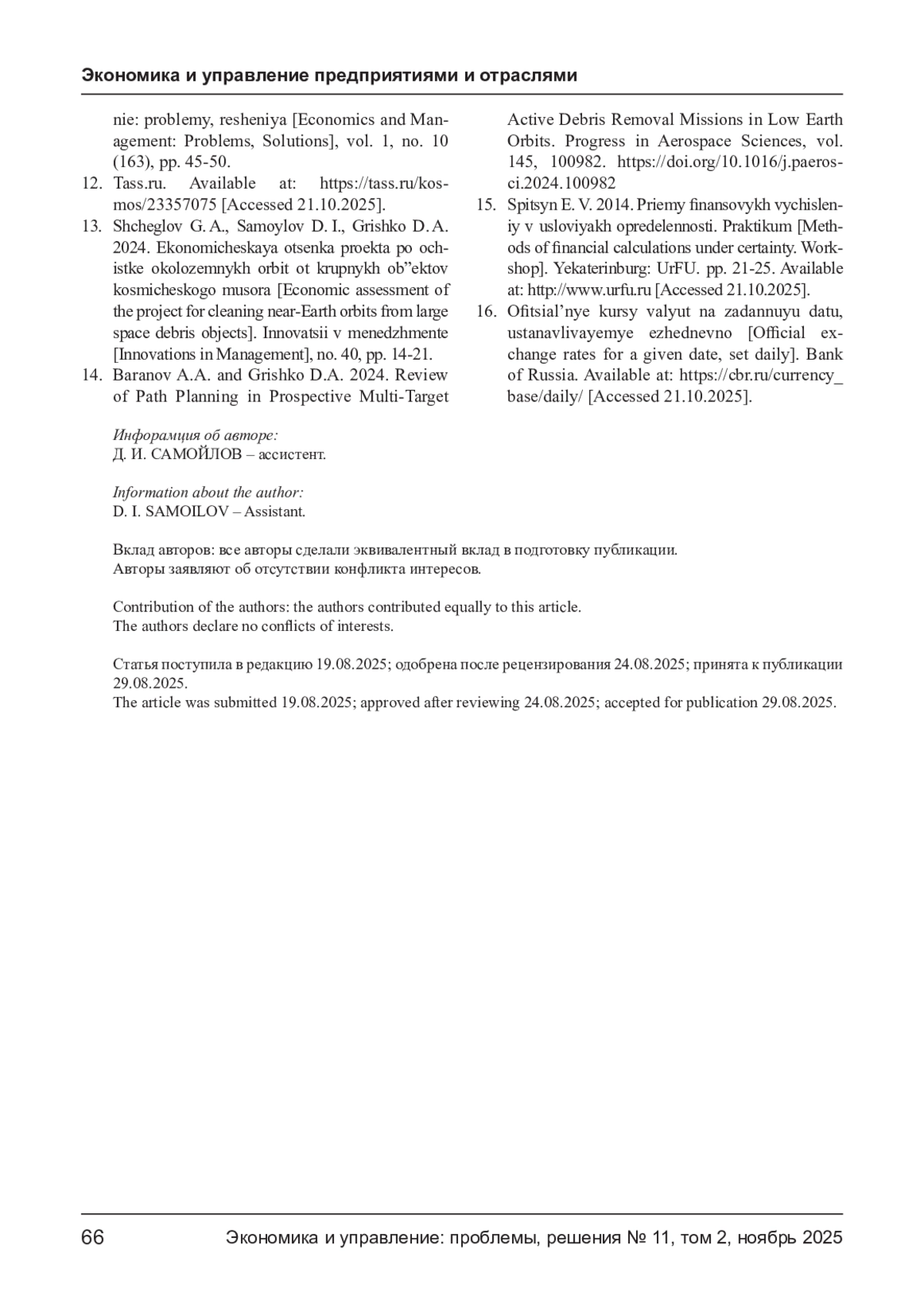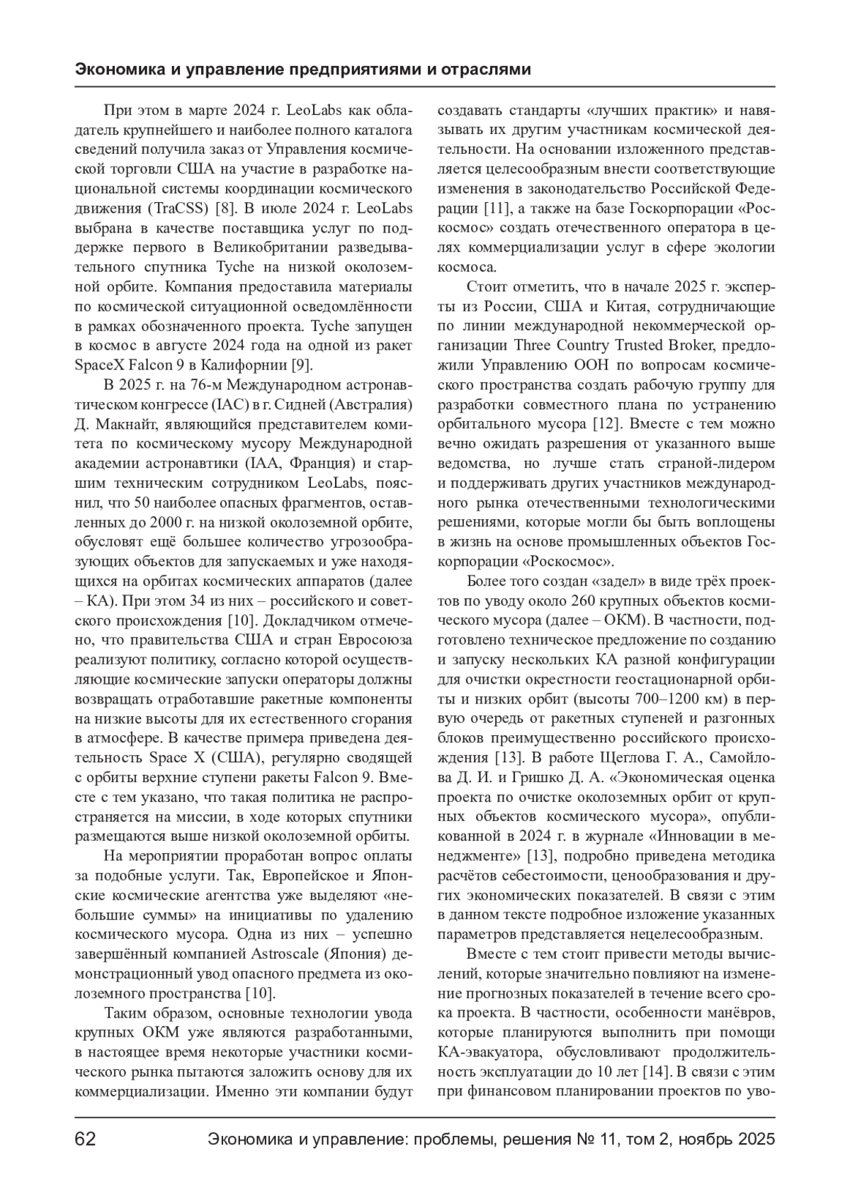 В статье рассмотрен наиболее вероятный макроэкономический прогноз развития нашей страны в краткосрочной перспективе, в условиях которого создание нового высокотехнологичного сегмента народного хозяйства представляется особенно актуальным. Раскрыта целесообразность в структурных изменениях в российской космической промышленности в части борьбы с космическим мусором, выполнена их экономическая оценка для последующей коммерциализации в интересах Госкорпорации «Роскосмос» с учётом нарастающих устремлений международных участников в этой сфере.