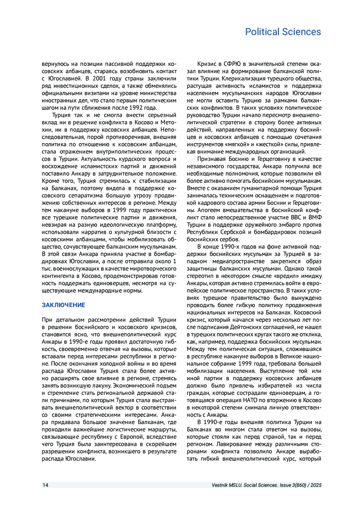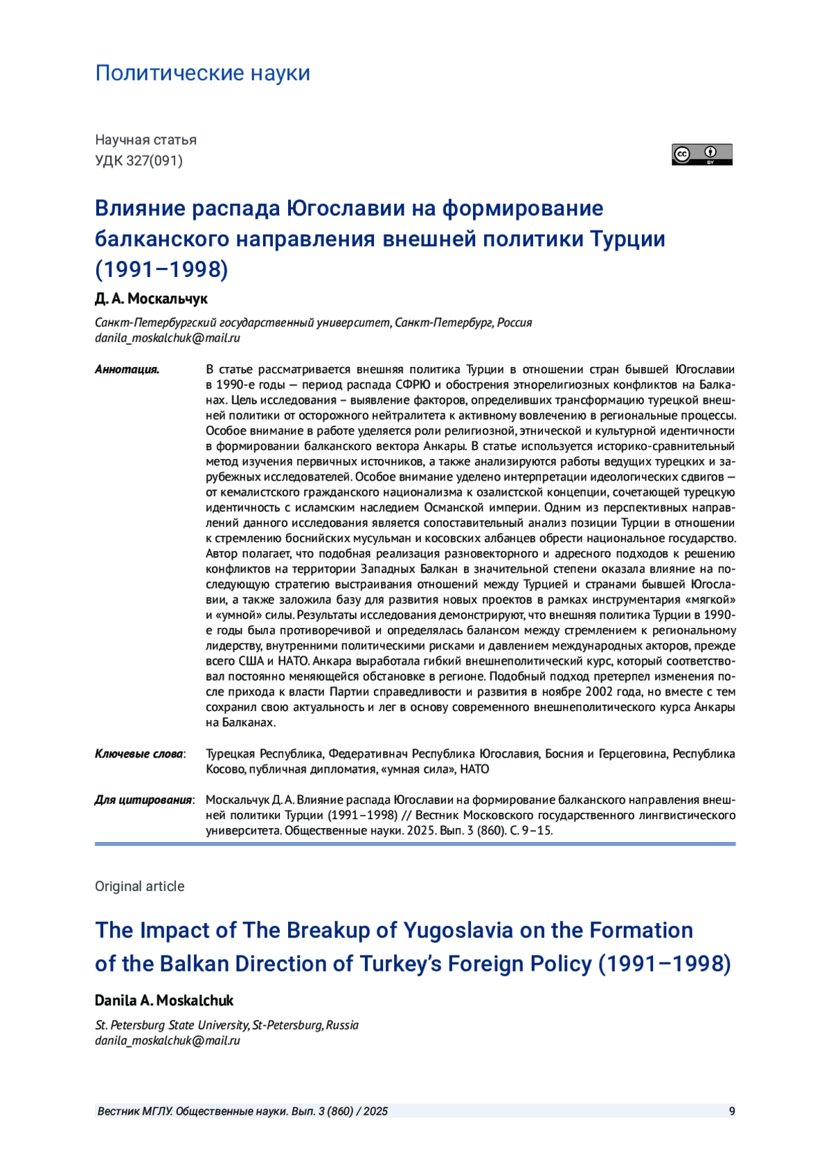 В статье рассматривается внешняя политика Турции в отношении стран бывшей Югославии в 1990-е годы - период распада СФРЮ и обострения этнорелигиозных конфликтов на Балканах. Цель исследования - выявление факторов, определивших трансформацию турецкой внешней политики от осторожного нейтралитета к активному вовлечению в региональные процессы. Особое внимание в работе уделяется роли религиозной, этнической и культурной идентичности в формировании балканского вектора Анкары. В статье используется историко-сравнительный метод изучения первичных источников, а также анализируются работы ведущих турецких и зарубежных исследователей. Особое внимание уделено интерпретации идеологических сдвигов - от кемалистского гражданского национализма к озалистской концепции, сочетающей турецкую идентичность с исламским наследием Османской империи. Одним из перспективных направлений данного исследования является сопоставительный анализ позиции Турции в отношении к стремлению боснийских мусульман и косовских албанцев обрести национальное государство. Автор полагает, что подобная реализация разновекторного и адресного подходов к решению конфликтов на территории Западных Балкан в значительной степени оказала влияние на последующую стратегию выстраивания отношений между Турцией и странами бывшей Югославии, а также заложила базу для развития новых проектов в рамках инструментария «мягкой» и «умной» силы. Результаты исследования демонстрируют, что внешняя политика Турции в 1990-е годы была противоречивой и определялась балансом между стремлением к региональному лидерству, внутренними политическими рисками и давлением международных акторов, прежде всего США и НАТО. Анкара выработала гибкий внешнеполитический курс, который соответствовал постоянно меняющейся обстановке в регионе. Подобный подход претерпел изменения после прихода к власти Партии справедливости и развития в ноябре 2002 года, но вместе с тем сохранил свою актуальность и лег в основу современного внешнеполитического курса Анкары на Балканах.