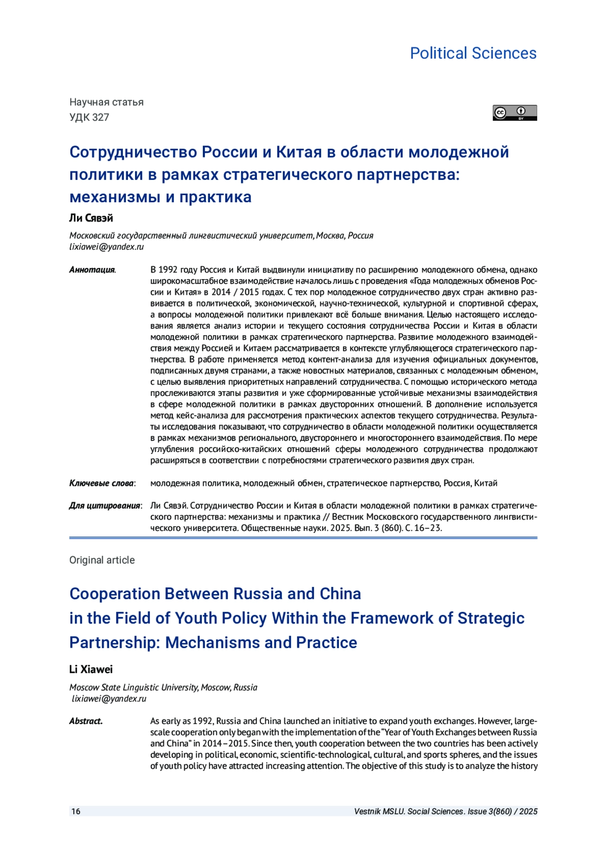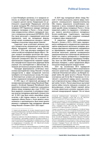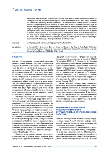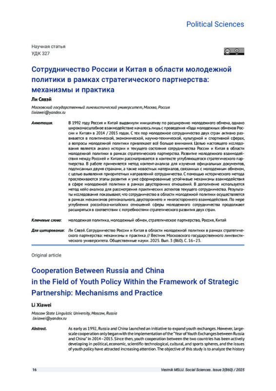 В 1992 году Россия и Китай выдвинули инициативу по расширению молодежного обмена, однако широкомасштабное взаимодействие началось лишь с проведения «Года молодежных обменов России и Китая» в 2014 / 2015 годах. С тех пор молодежное сотрудничество двух стран активно развивается в политической, экономической, научно-технической, культурной и спортивной сферах, а вопросы молодежной политики привлекают всё больше внимания. Целью настоящего исследования является анализ истории и текущего состояния сотрудничества России и Китая в области молодежной политики в рамках стратегического партнерства. Развитие молодежного взаимодействия между Россией и Китаем рассматривается в контексте углубляющегося стратегического партнерства. В работе применяется метод контент-анализа для изучения официальных документов, подписанных двумя странами, а также новостных материалов, связанных с молодежным обменом, с целью выявления приоритетных направлений сотрудничества. С помощью исторического метода прослеживаются этапы развития и уже сформированные устойчивые механизмы взаимодействия в сфере молодежной политики в рамках двусторонних отношений. В дополнение используется метод кейс-анализа для рассмотрения практических аспектов текущего сотрудничества. Результаты исследования показывают, что сотрудничество в области молодежной политики осуществляется в рамках механизмов регионального, двустороннего и многостороннего взаимодействия. По мере углубления российско-китайских отношений сферы молодежного сотрудничества продолжают расширяться в соответствии с потребностями стратегического развития двух стран.