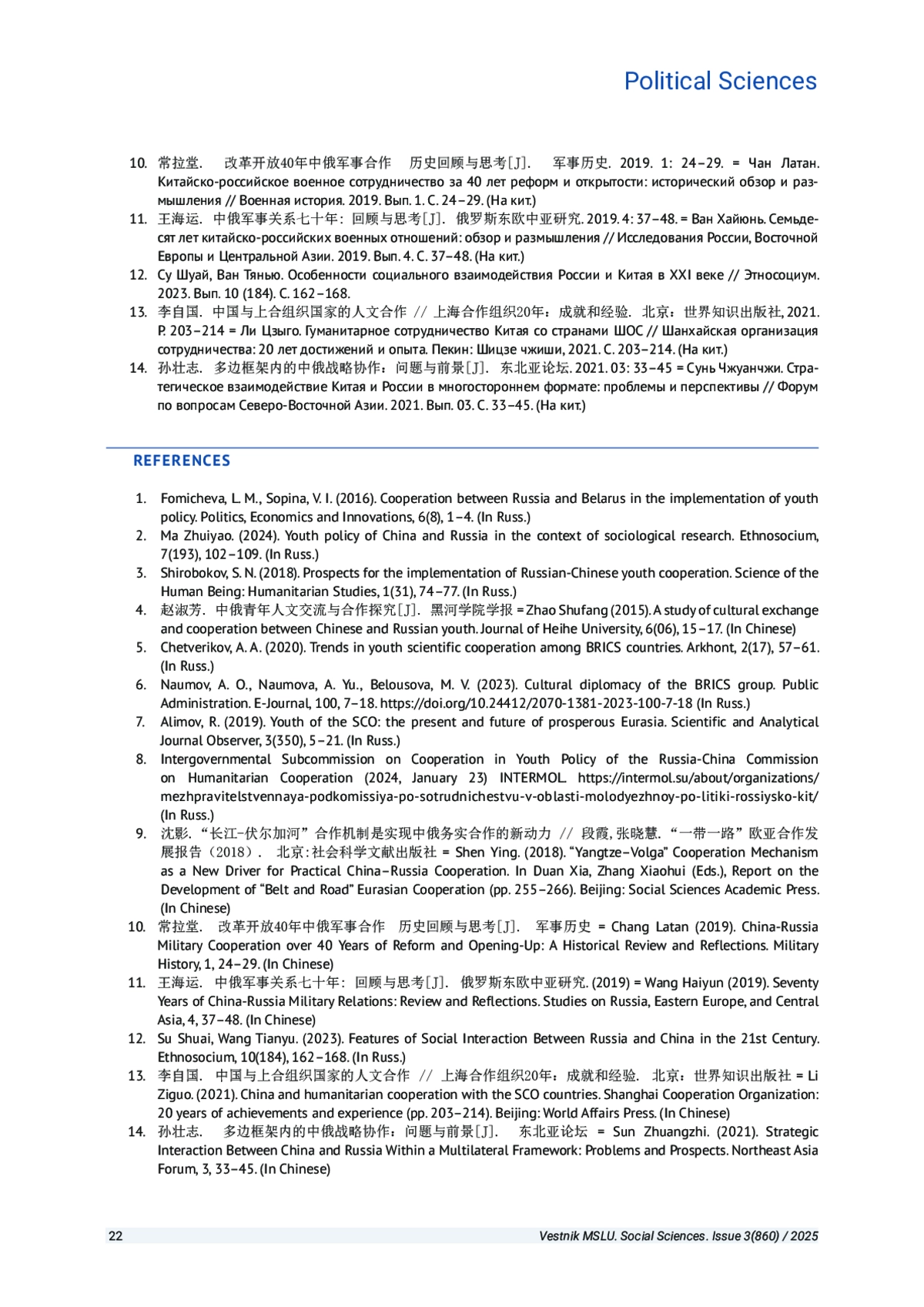 12. Су Шуай, Ван Тянью. Особенности социального взаимодействия России и Китая в XХI веке // Этносоциум. 2023. Вып. 10 (184). С. 162-168.
