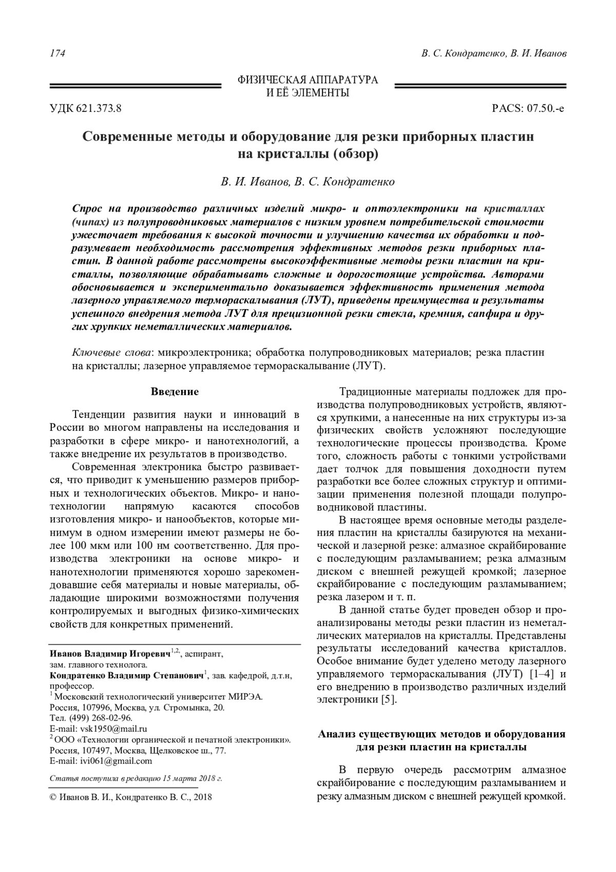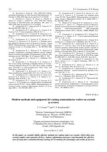 V. I. Ivanov and V. S. Kondratenko Modern methods and equipment for cutting semiconductor wafers on crystals (a review) 174