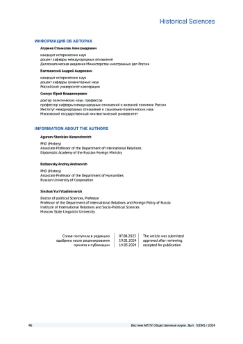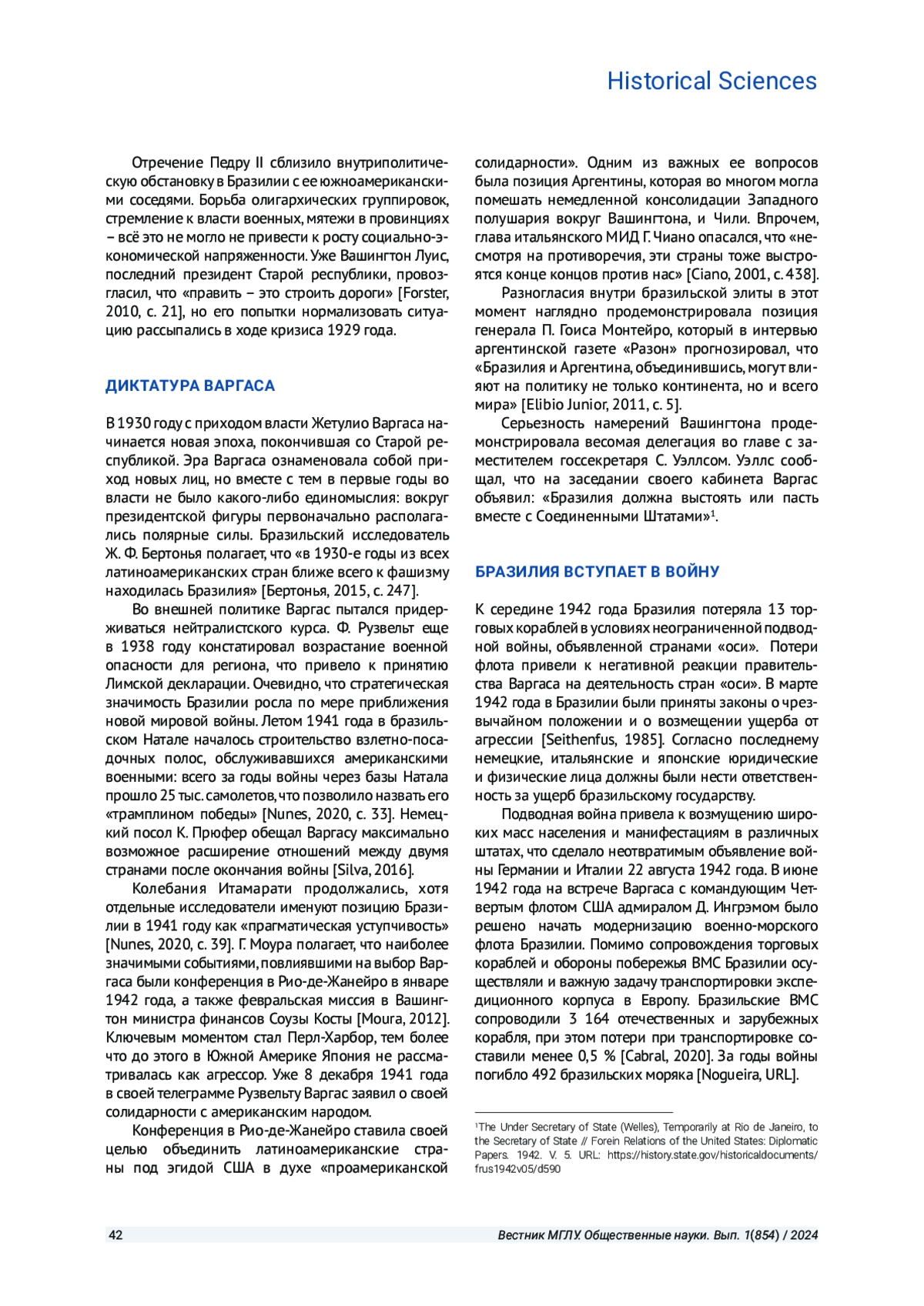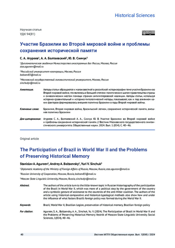 Авторы статьи обращаются к малоизвестной в российской историографии теме участия Бразилии во Второй мировой войне, что являлось в большей степени политическим шагом правительства страны и символическим жестом помощи странам антигитлеровской коалиции. Авторы статьи, используя историко-сравнительный и историко-типологический методы, показывают, как и под влиянием каких факторов формировалась внешняя политика Бразилии в годы Второй мировой войны.