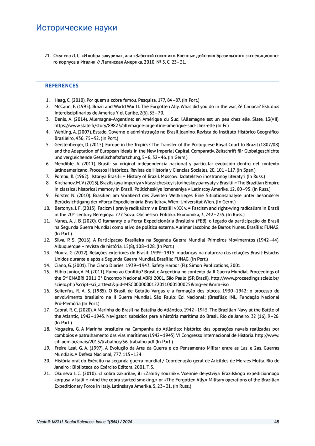 21. Окунева Л. С. “И кобра закурила”, или “Забытый союзник”. Военные действия Бразильского экспедиционного корпуса в Италии // Латинская Америка. 2010. № 5. С. 23-31. EDN: LRFFHJ
