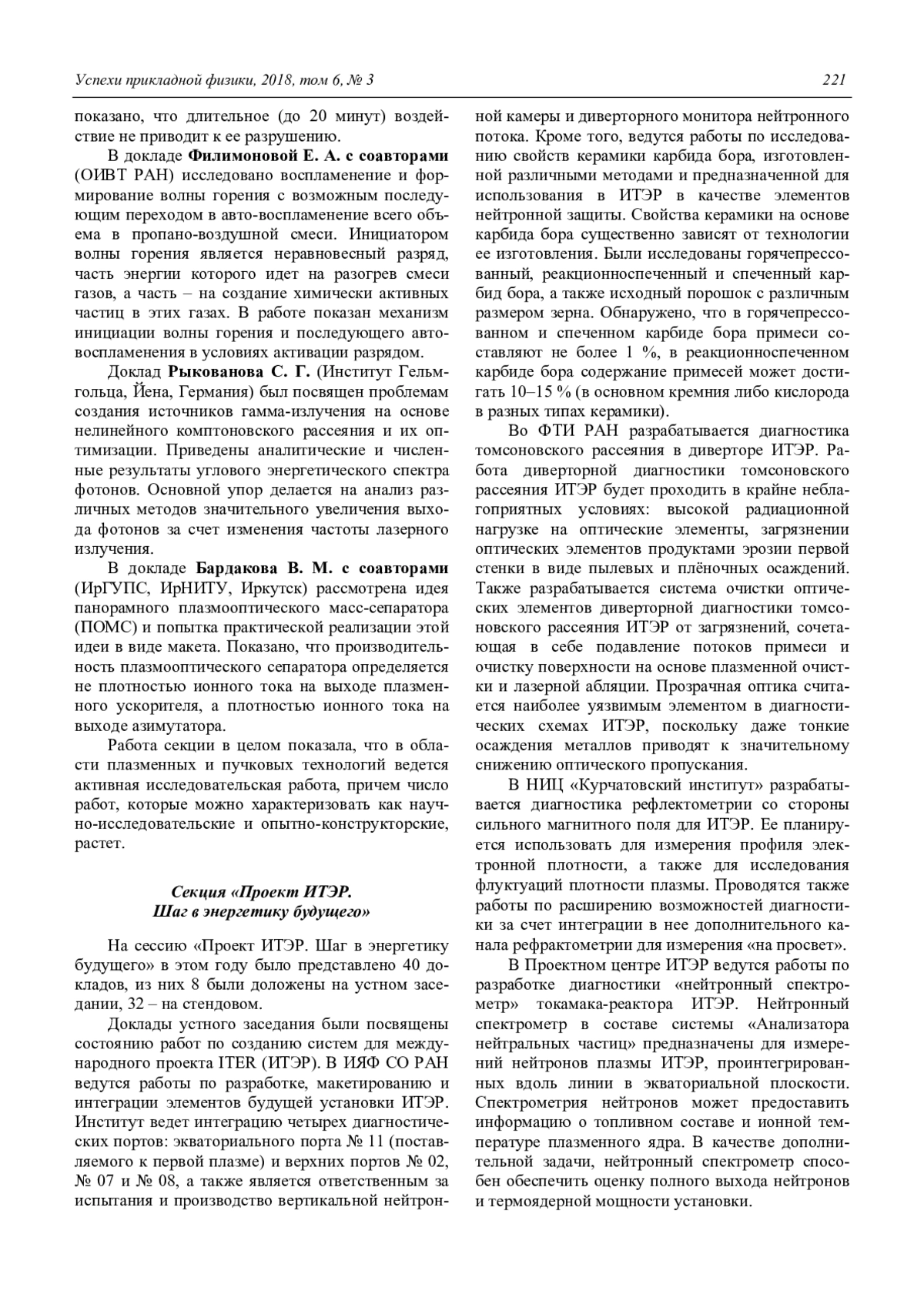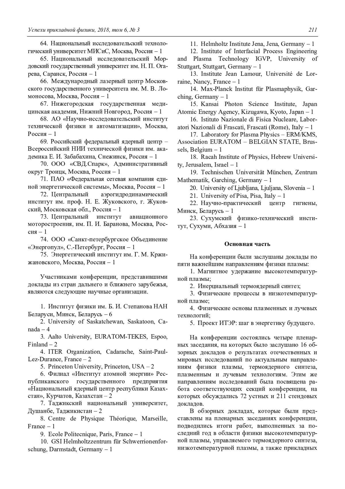 Основные итоги исследований в области физики плазмы и управляемого термоядерного синтеза в России в 2017 году (Обзор материалов XLV Международной Звенигородской конференции по физике плазмы и управляемому термоядерному синтезу, 2–6 апреля 2018 г.) Гришина И. А., Иванов В. А., Коврижных Л. М. 209