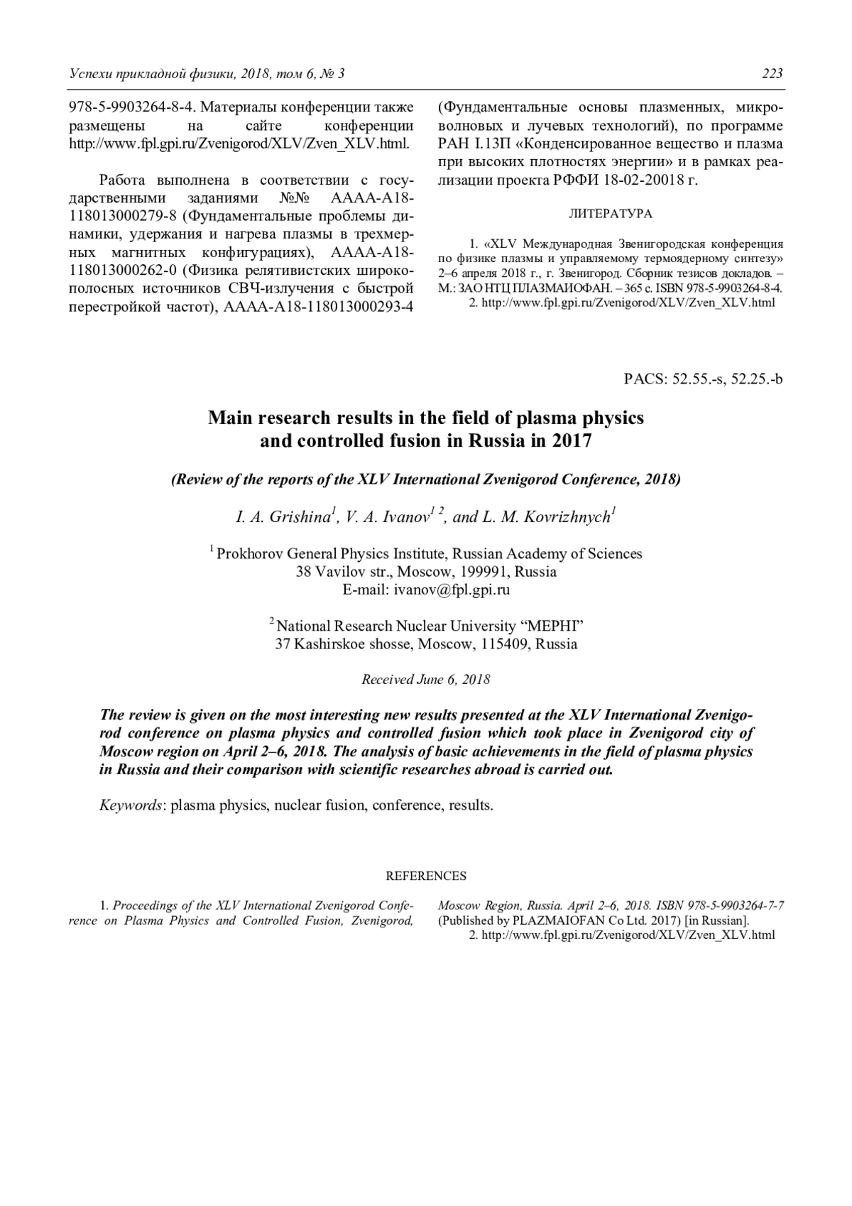 Main research results in the field of plasma physics and controlled fusion in Russia in 2017 (Review of the reports of the XLV International Zvenigorod Conference, 2018) I. A. Grishina, V. A. Ivanov, and L. M. Kovrizhnych 209