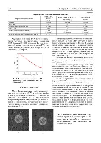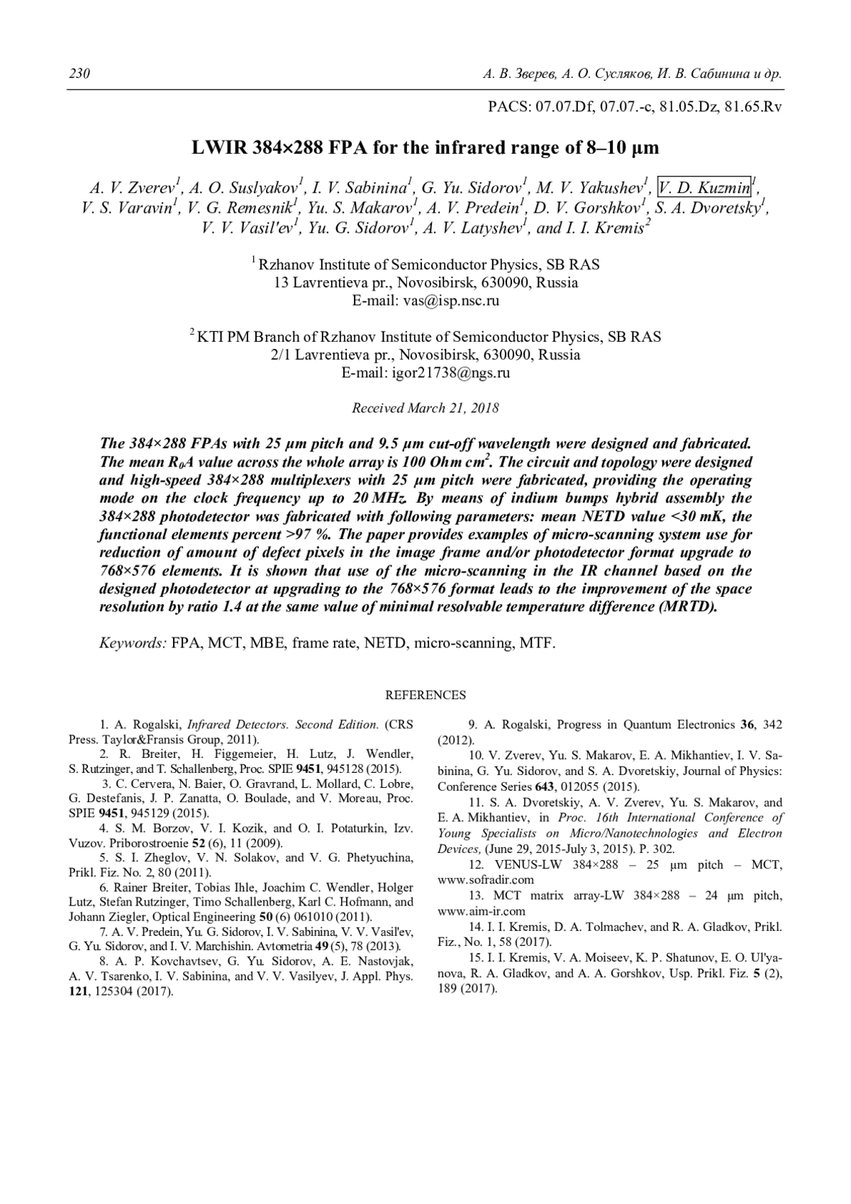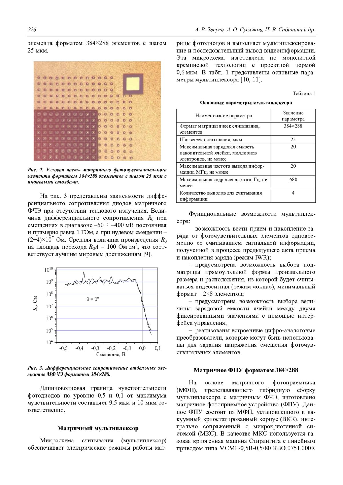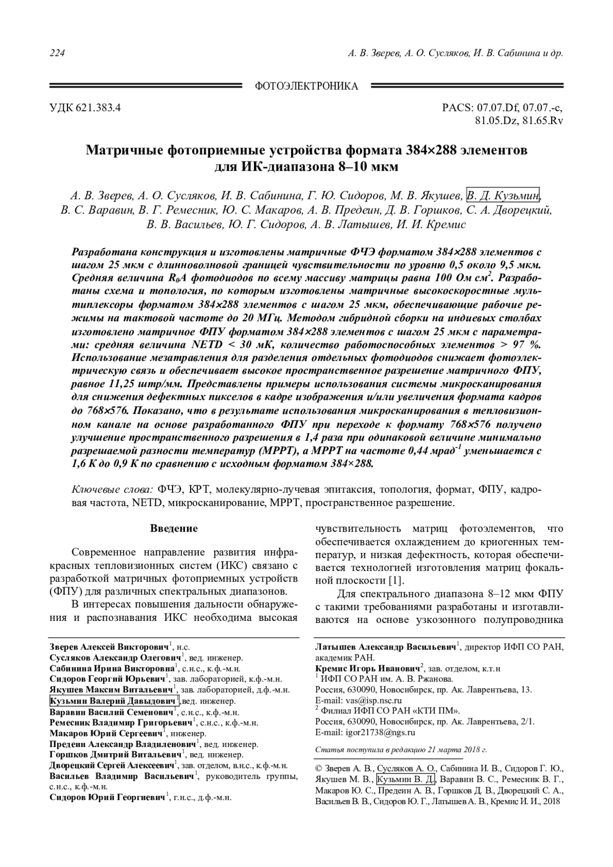 Разработана конструкция и изготовлены матричные ФЧЭ форматом 384288 элементов с шагом 25 мкм с длинноволновой границей чувствительности по уровню 0,5 около 9,5 мкм. Средняя величина R0А фотодиодов по всему массиву матрицы равна 100 Ом см2. Разработаны схема и топология, по которым изготовлены матричные высокоскоростные мультиплексоры форматом 384288 элементов с шагом 25 мкм, обеспечивающие рабочие режимы на тактовой частоте до 20 МГц. Методом гибридной сборки на индиевых столбах изготовлено матричное ФПУ форматом 384288 элементов с шагом 25 мкм с параметрами: средняя величина NETD < 30 мК, количество работоспособных элементов > 97 %. Использование мезатравления для разделения отдельных фотодиодов снижает фотоэлектрическую связь и обеспечивает высокое пространственное разрешение матричного ФПУ, равное 11,25 штр/мм. Представлены примеры использования системы микросканирования для снижения дефектных пикселов в кадре изображения и/или увеличения формата кадров до 768576. Показано, что в результате использования микросканирования в тепловизионном канале на основе разработанного ФПУ при переходе к формату 768576 получено улучшение пространственного разрешения в 1,4 раза при одинаковой величине минимально разрешаемой разности температур (МРРТ), а МРРТ на частоте 0,44 мрад-1 уменьшается с 1,6 К до 0,9 К по сравнению с исходным форматом 384×288.
