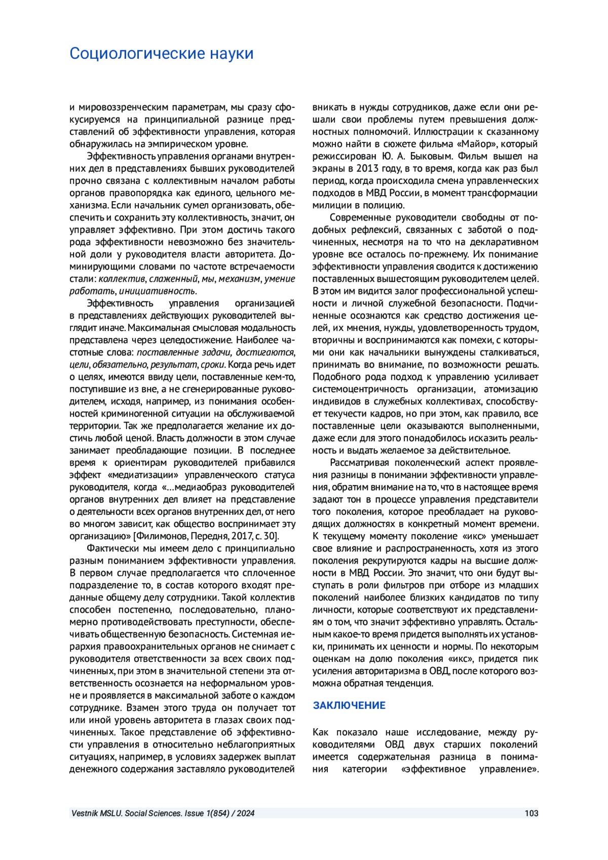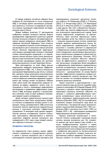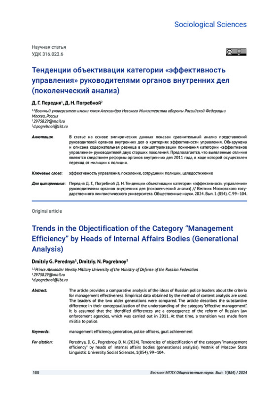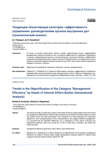В статье на основе эмпирических данных показан сравнительный анализ представлений руководителей органов внутренних дел о критериях эффективности управления. Обнаружена и описана содержательная разница в концептуализации понимания категории «эффективное управление» руководителей двух старших поколений. Предполагается, что выявленные отличия являются следствием реформы органов внутренних дел 2011 года, в ходе которой осуществлен переход от милиции к полиции.