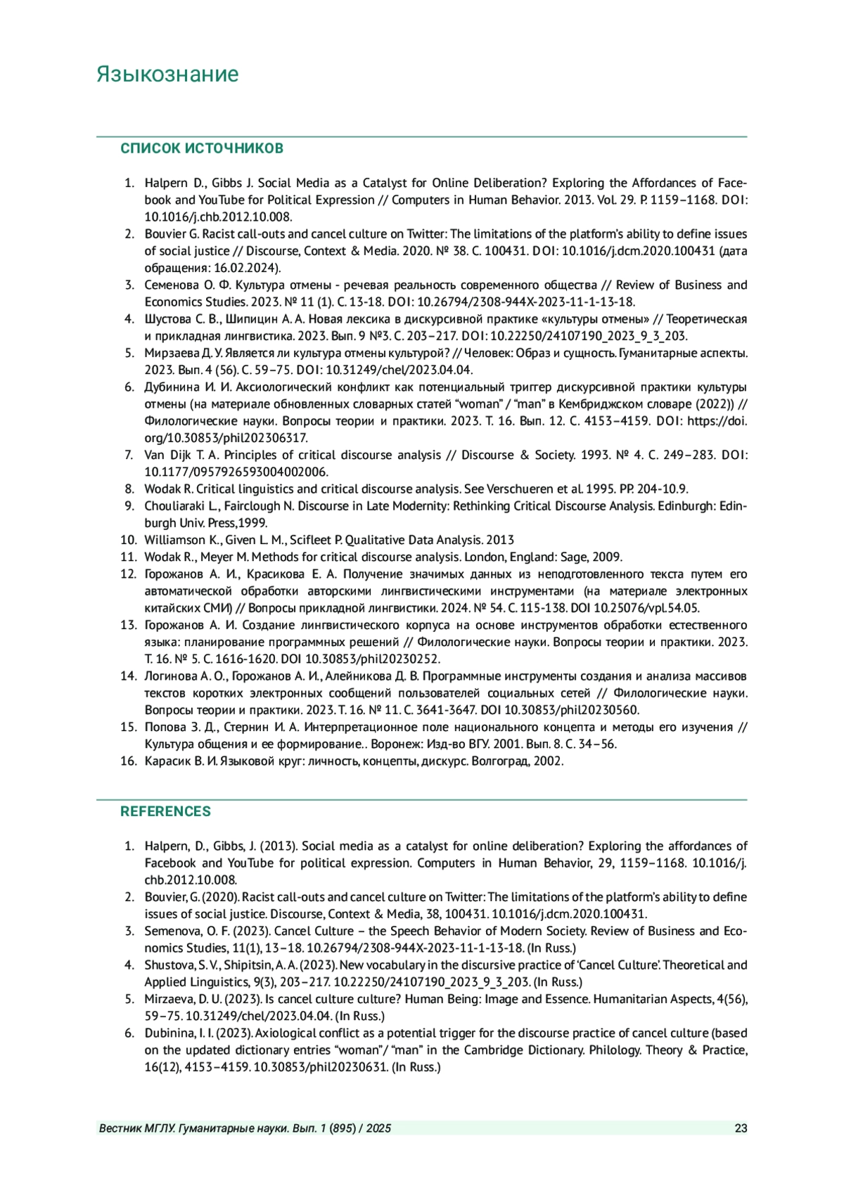 6. Дубинина И. И. Аксиологический конфликт как потенциальный триггер дискурсивной практики культуры отмены (на материале обновленных словарных статей “woman” / “man” в Кембриджском словаре (2022)) // Филологические науки. Вопросы теории и практики. 2023. Т. 16. Вып. 12. C. 4153-4159. DOI: 10.30853/phil202306317 EDN: XGVEJE
