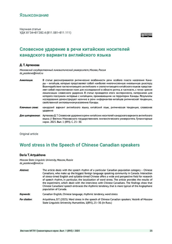 1. Поздеева Д. Т. Канадская идентичность в словесном ударении // Вестник Московского государственного лингвистического университета. Гуманитарные науки. 2017. Вып. 3 (771). С. 67-79. EDN: YPJEJW