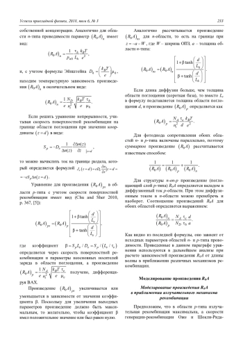 Уменьшение темнового диффузионного тока на границе раздела поглощающего слоя и подложки z = d до нулевого значения Je(z = d) = 0. Для технической реализации данного условия формируется область высокой концентрации р+-типа на границе раздела р-области, например, методом МЛЭ. Переход p+–p-типа будет блокировать неосновные носители заряда, дополнительно за счет высокого легирования p+-слоя формируется омический контакт для основных носителей заряда при подаче обратного смещения к р-области, основы функционирования структур n+–p–p+-типа представлены в работах (Ashley and Elliott 1985, [22, 23]).