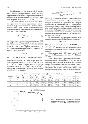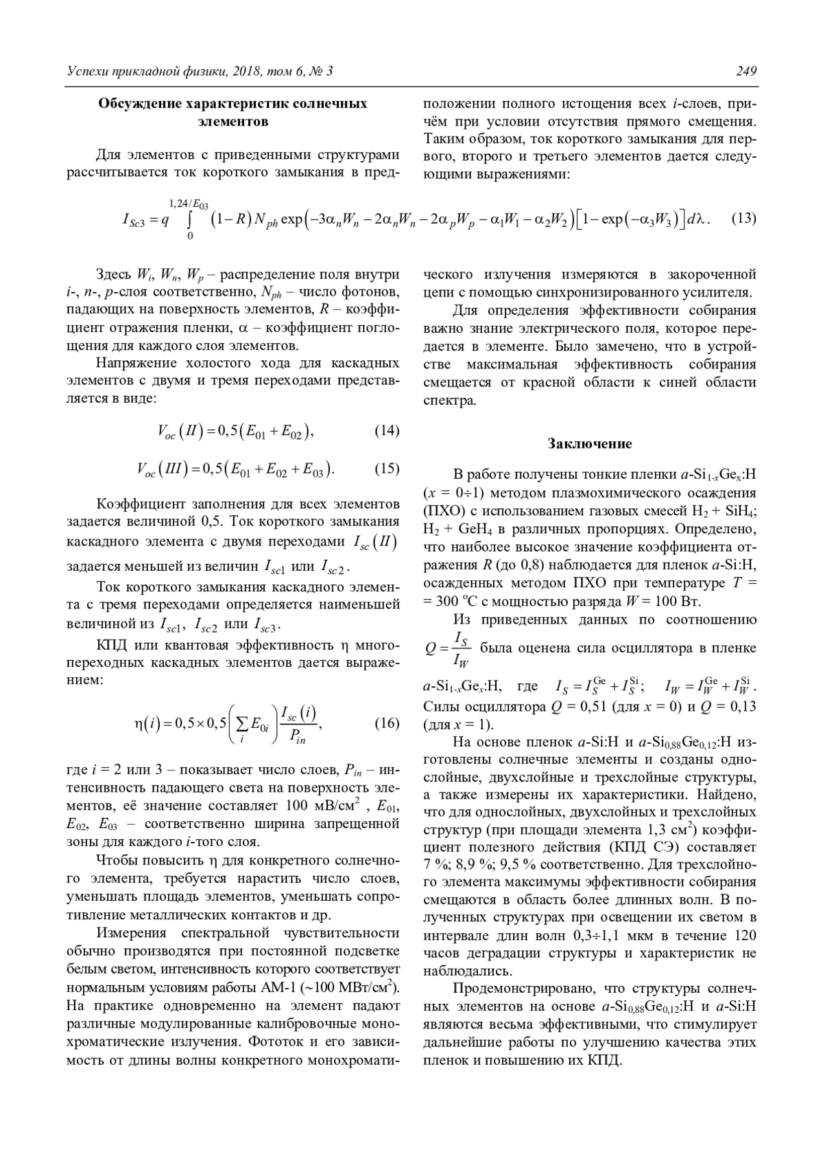В работе проанализированы возможности применения технологии плазмохимического осаждения пленок а-Si1-xGex: H (x = 0÷1), нелегированных и легированных PH3 и B2H6, для использования их в p–i–n-структурах солнечных элементов. Рассмотрены оптические, электрические, фотоэлектрические свойства, а также определено количество водорода в данной пленке. Найдено, что свойства пленки сильно зависит от состава и уровня гидрогенизации. Количество атомов водорода в пленках варьировали путем изменения составов газовой смеси, и измеряли ИК-поглощение для пленок а-Si: H и а-Ge: H. На основе пленок а-Si: H и а-Si0,88Ge0,12: H изготовлены солнечные элементы и созданы однослойные, двухслойные и трехслойные структуры, при этом измерены их оптоэлектронные характеристики. Найдено, что при площади элемента 1,3 см2 коэффициент полезного действия солнечного элемента (КПД СЭ) составляет соответственно 7; 8,9; 9,5 %.