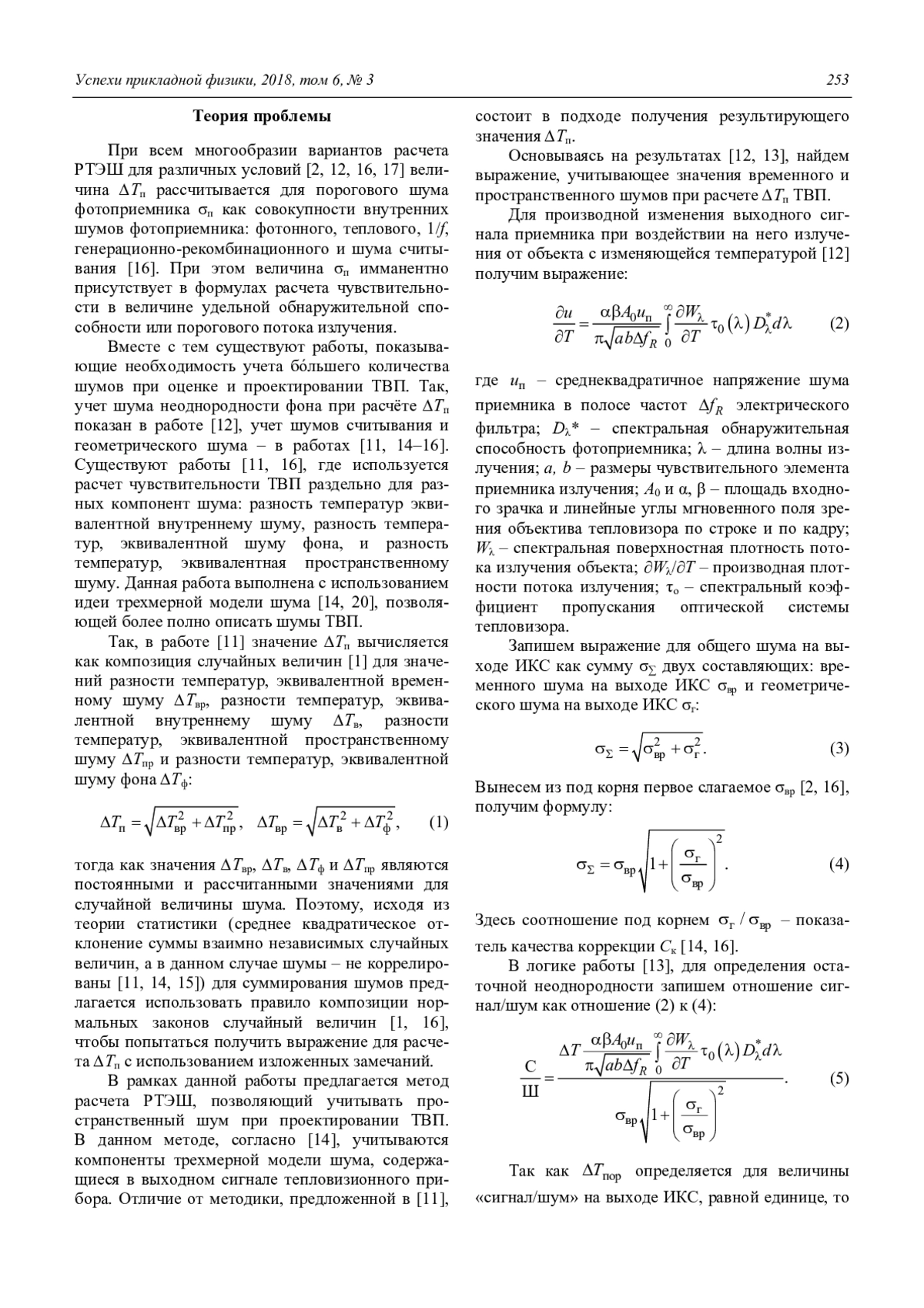 В работе получен метод расчета РТЭШ учитывающий компоненты трехмерной модели шума при оценке и проектировании ТВП. Используемый в расчетах коэффициент степени коррекции Ск является количественным критерием, связывающим температурную чувствительность ΔТп и качество тепловизионного изображения. Таким образом, коэффициент Ск позволяет включить показатель качества изображения в процесс оптимизации ТВП и тем самым определить преимущество в показателях назначения разрабатываемого изделия перед аналогами.