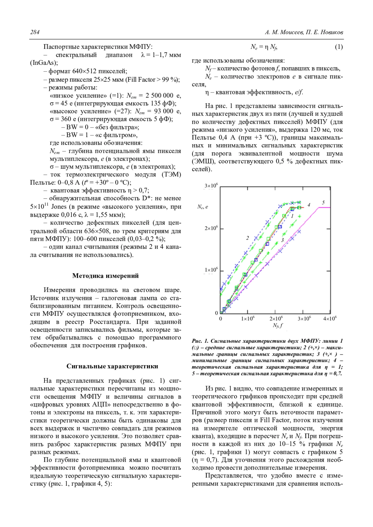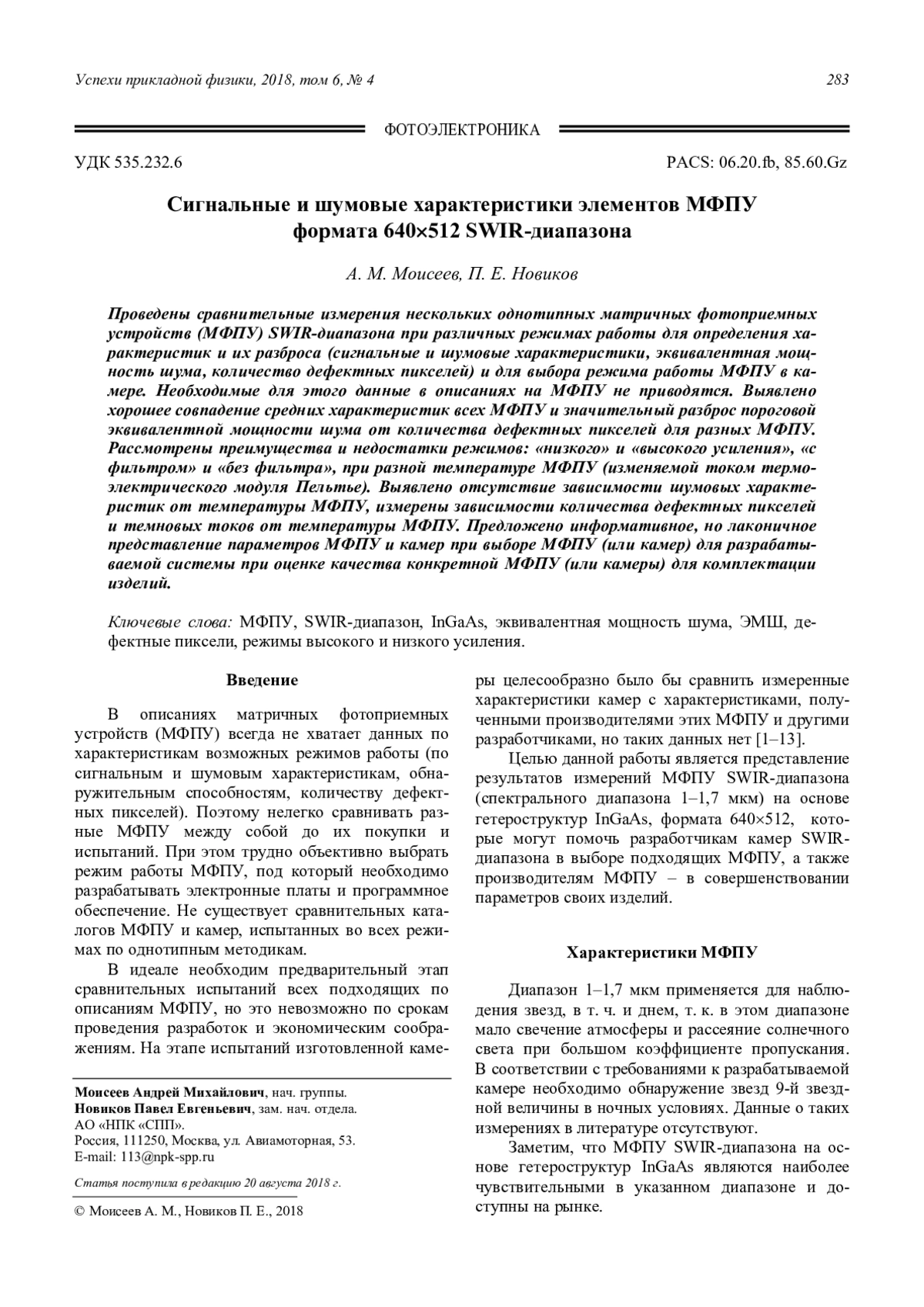 МОИСЕЕВ А. М., НОВИКОВ П. Е. СИГНАЛЬНЫЕ И ШУМОВЫЕ ХАРАКТЕРИСТИКИ ЭЛЕМЕНТОВ МФПУ ФОРМАТА 640512 SWIR-ДИАПАЗОНА // УСПЕХИ ПРИКЛАДНОЙ ФИЗИКИ. 2018. ТОМ 6, №4