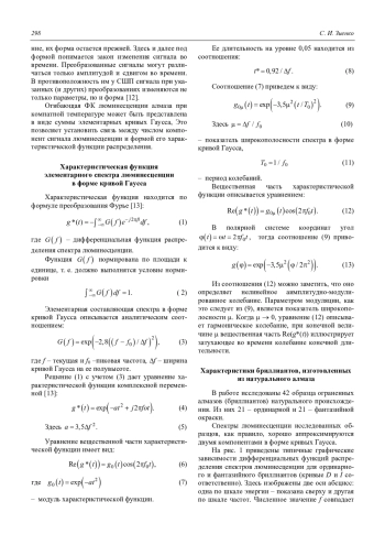 Выполнено комплексное исследование бриллиантов различного происхождения при комнатной температуре. Для натуральных бриллиантов и бриллиантов, облученных потоком электронов, получено уравнение характеристической функции в аналитическом виде, которая монотонно спадает во времени. Синтетические и облагороженные бриллианты имеют характеристические функции, которые могут быть получены только численным методом. Они содержат пульсации, амплитуда которых случайным образом меняется во времени. Форма их заметно отличается от кривых натуральных бриллиантов, что позволяет определить их происхождения.