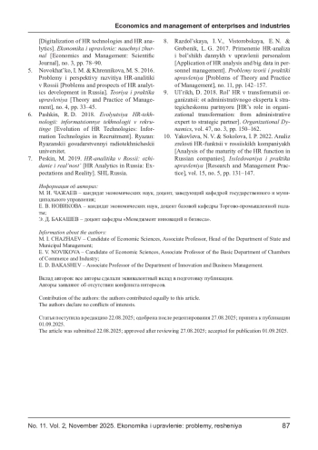 4. Нагибина Н. И., Щукина А. А. Цифровизация HR-технологий и HR-аналитики // Экономика и управление: научный журнал. - 2017. - № 3. - С. 78-90.