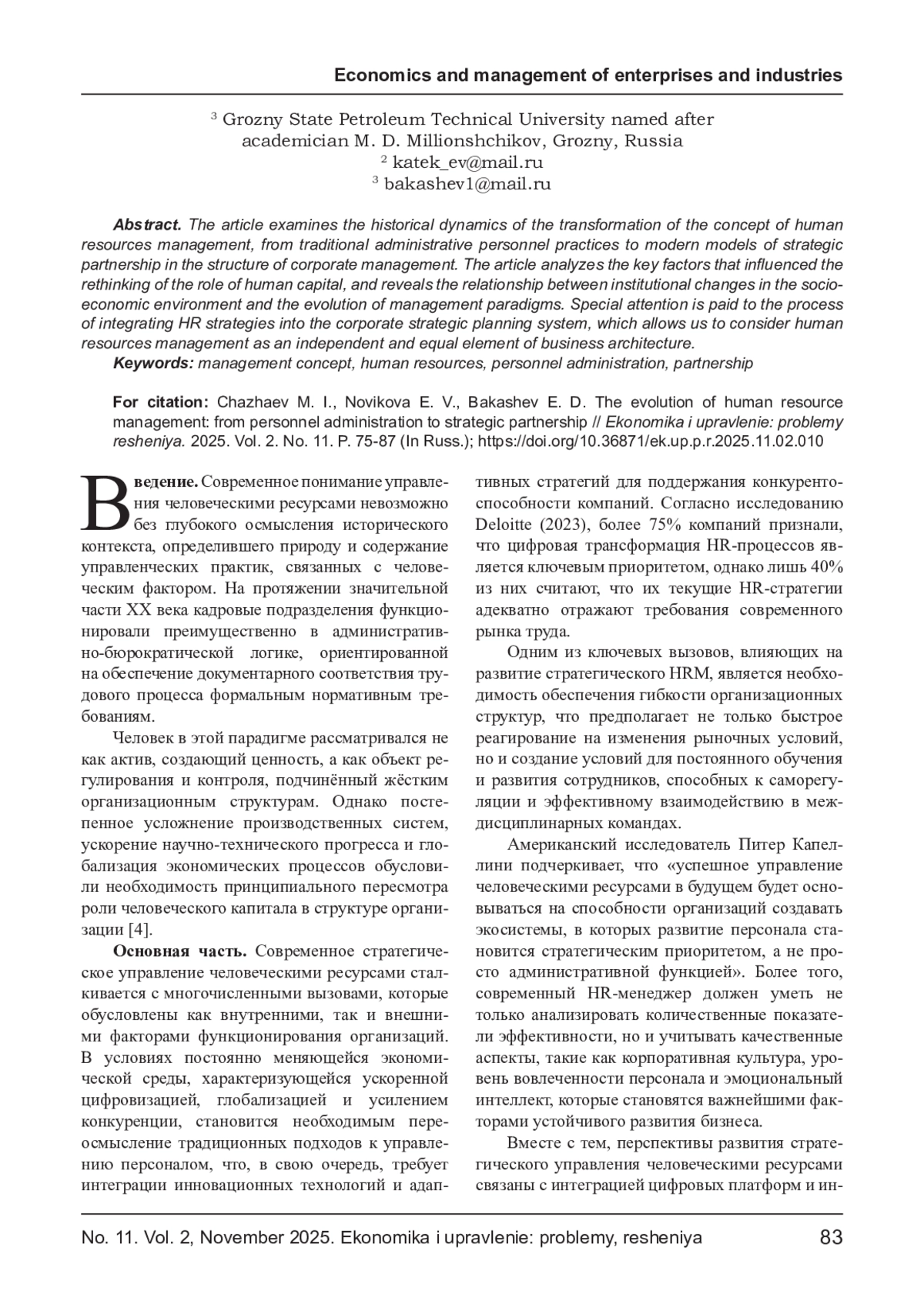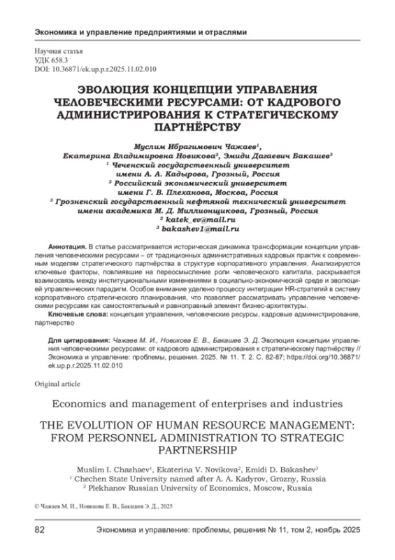 В статье рассматривается историческая динамика трансформации концепции управления человеческими ресурсами - от традиционных административных кадровых практик к современным моделям стратегического партнёрства в структуре корпоративного управления. Анализируются ключевые факторы, повлиявшие на переосмысление роли человеческого капитала, раскрывается взаимосвязь между институциональными изменениями в социально-экономической среде и эволюцией управленческих парадигм. Особое внимание уделено процессу интеграции HR-стратегий в систему корпоративного стратегического планирования, что позволяет рассматривать управление человеческими ресурсами как самостоятельный и равноправный элемент бизнес-архитектуры.