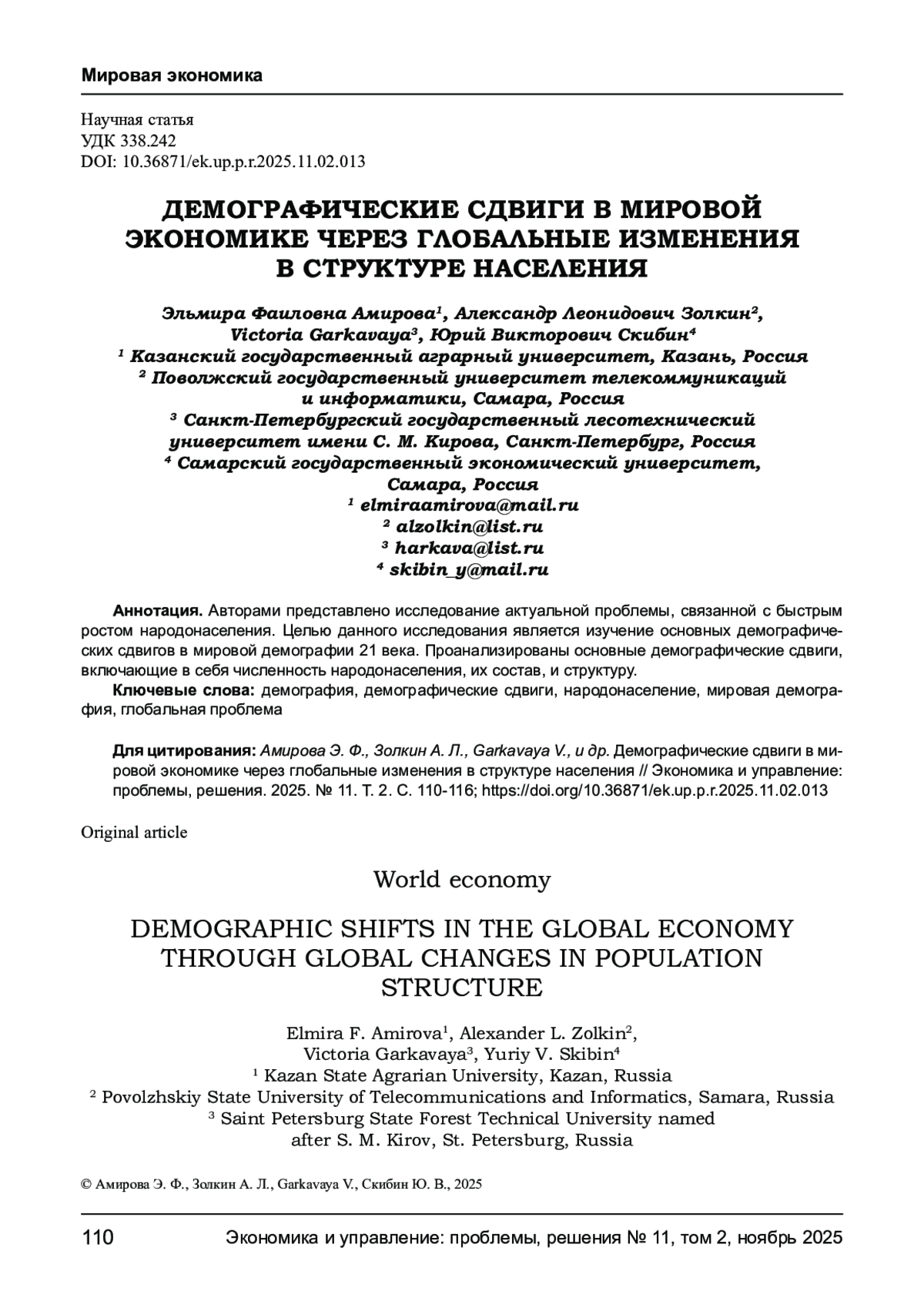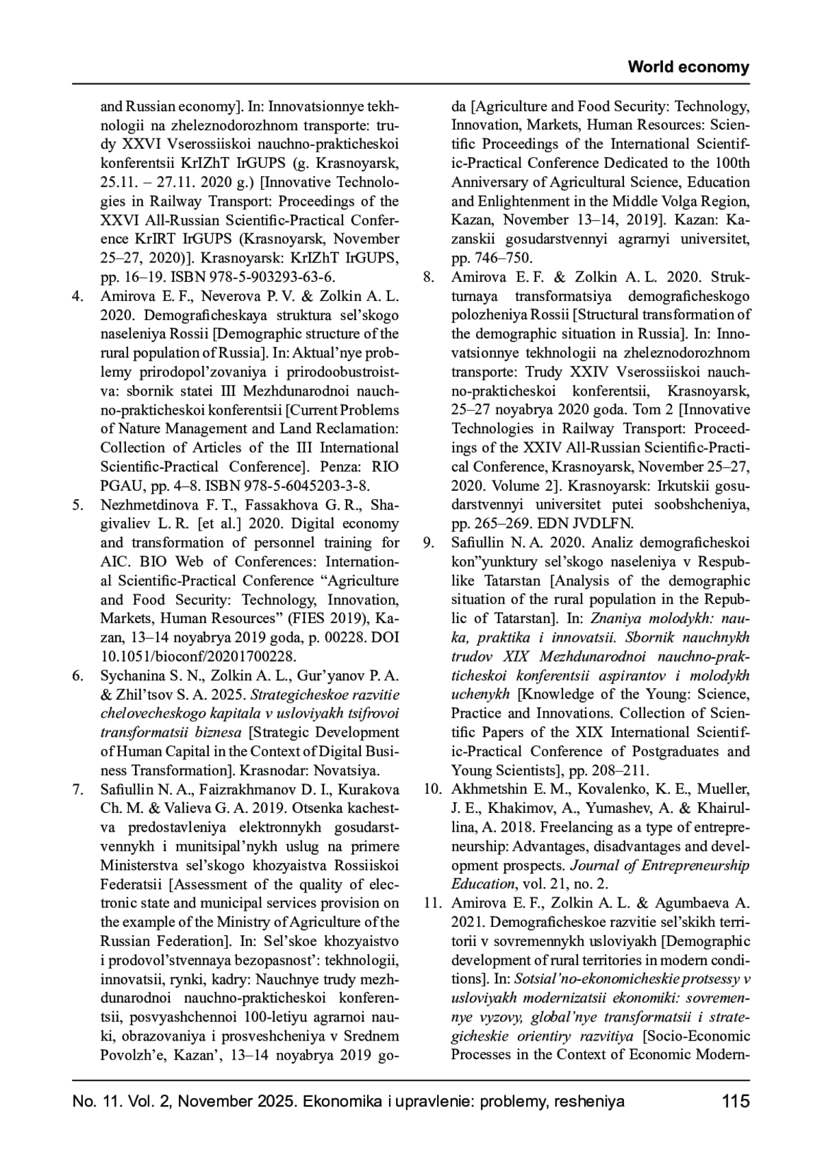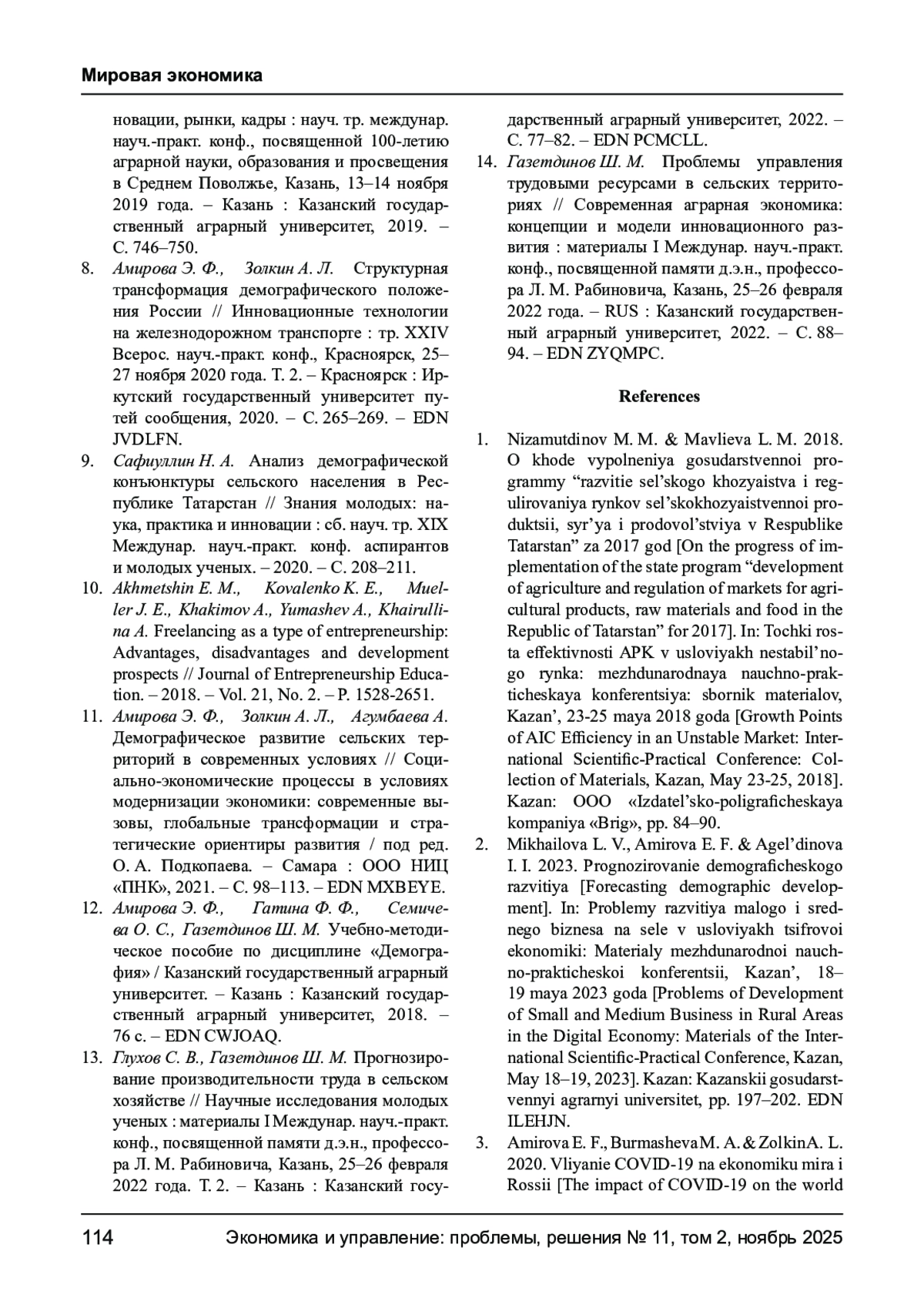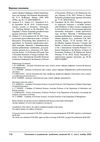 11. Амирова Э. Ф., Золкин А. Л., Агумбаева А. Демографическое развитие сельских территорий в современных условиях // Социально-экономические процессы в условиях модернизации экономики: современные вызовы, глобальные трансформации и стратегические ориентиры развития / под ред. О. А. Подкопаева. - Самара: ООО НИЦ “ПНК”, 2021. - С. 98-113. EDN: MXBEYE