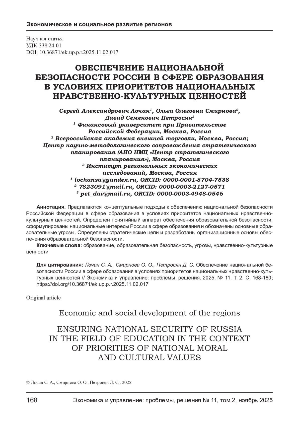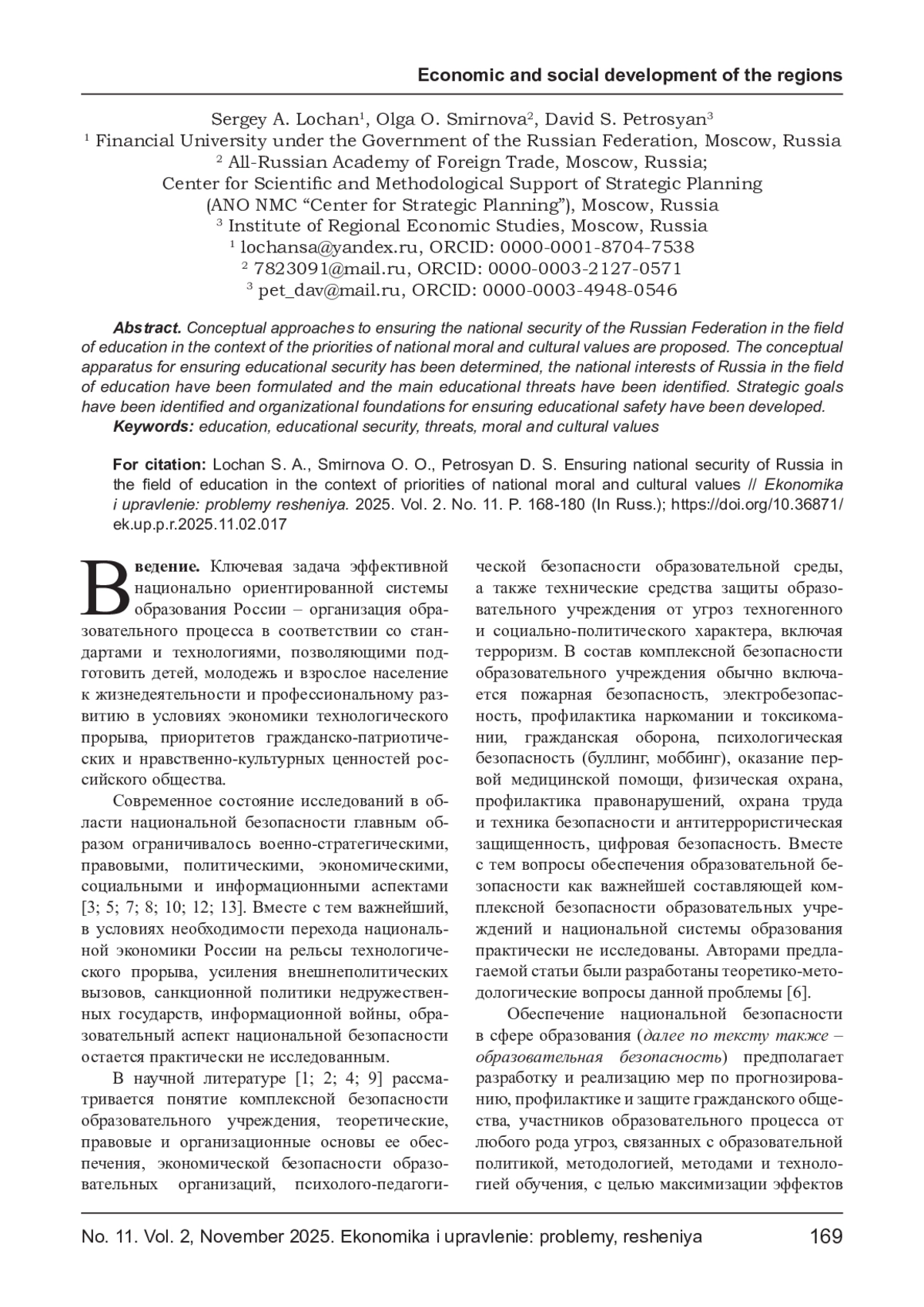 6. Лочан С. А., Петросян Д. С. Обеспечение образовательной безопасности России: монография. - М.: Русанс, 2018. - 84 с. EDN: YLBXMT