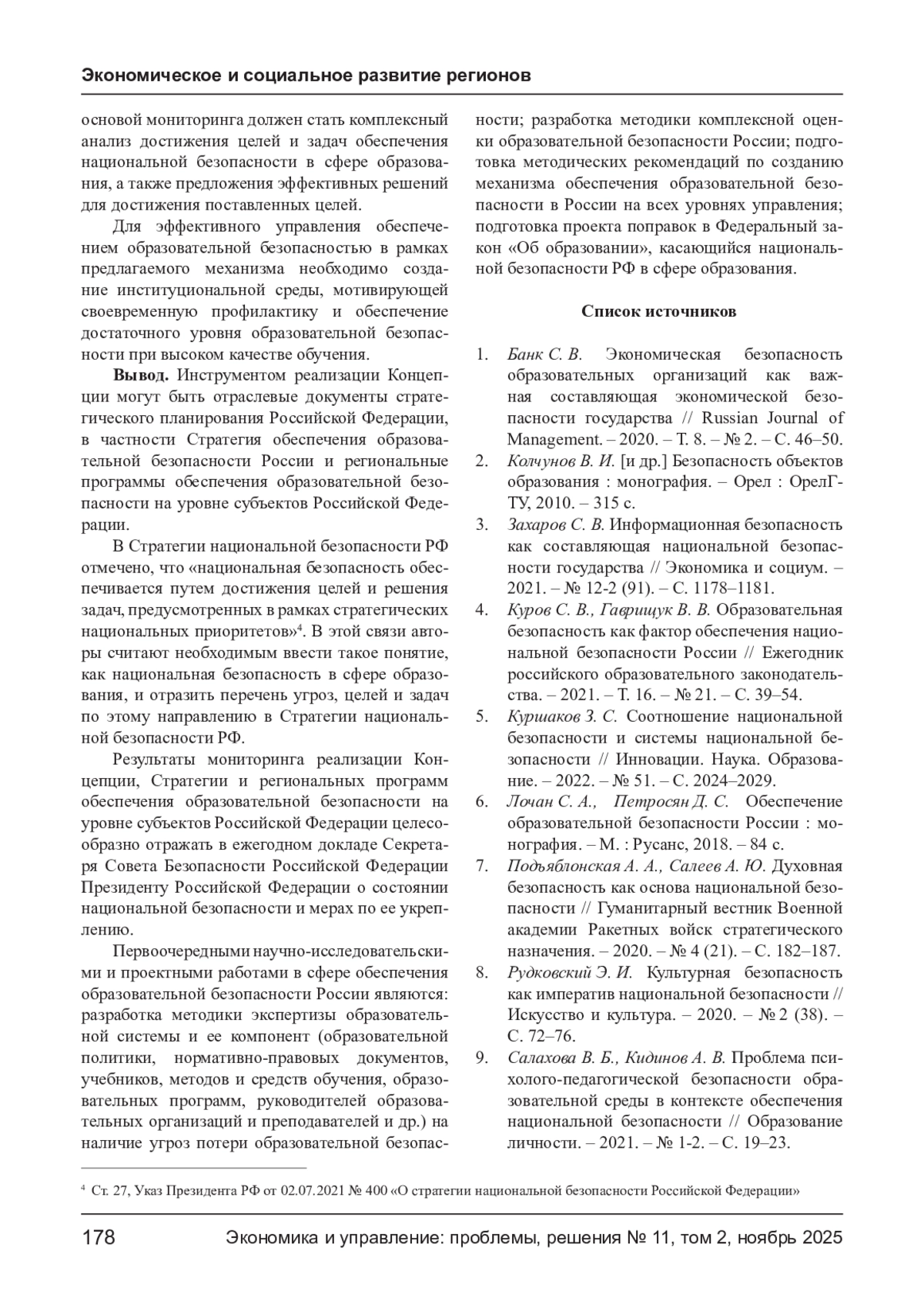 1. Банк С. В. Экономическая безопасность образовательных организаций как важная составляющая экономической безопасности государства // Russian Journal of Management. - 2020. - Т. 8. - № 2. - С. 46-50. EDN: FHQLCF