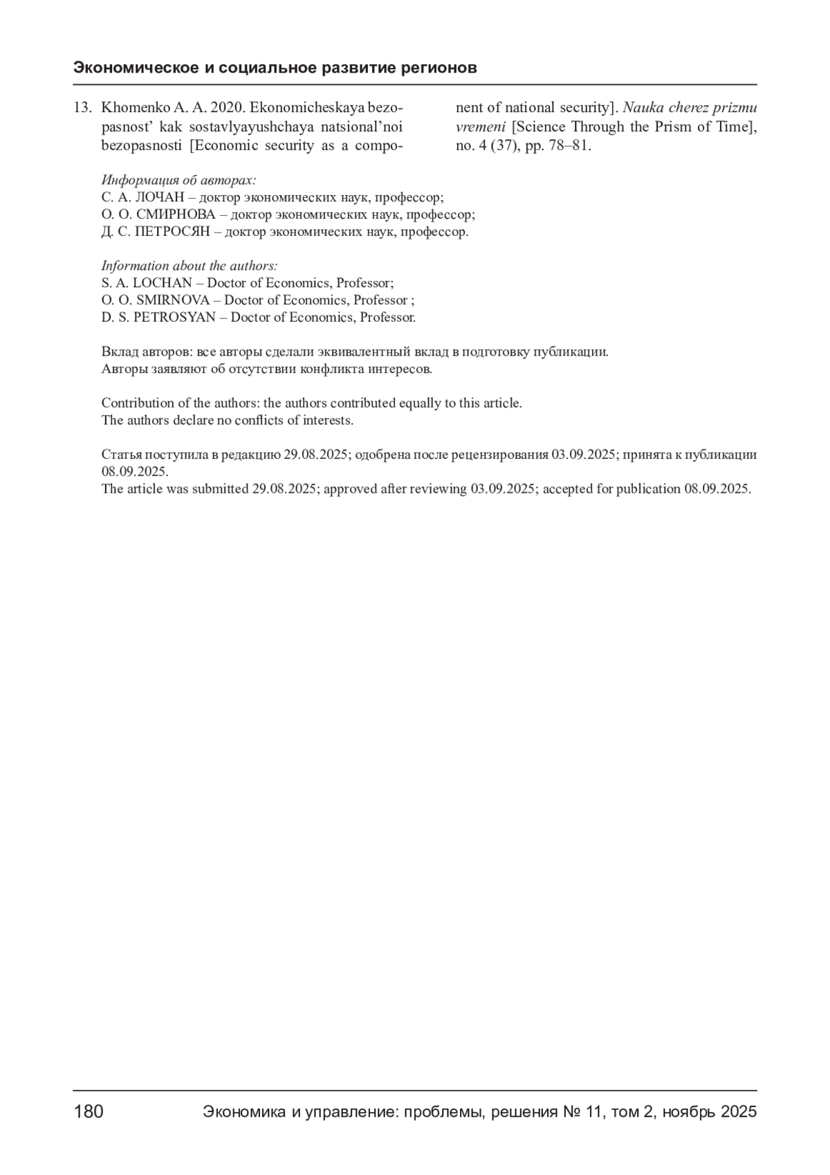 13. Хоменко А. А. Экономическая безопасность как составляющая национальной безопасности // Наука через призму времени. - 2020. - № 4 (37). - С. 78-81. EDN: YXPIPC