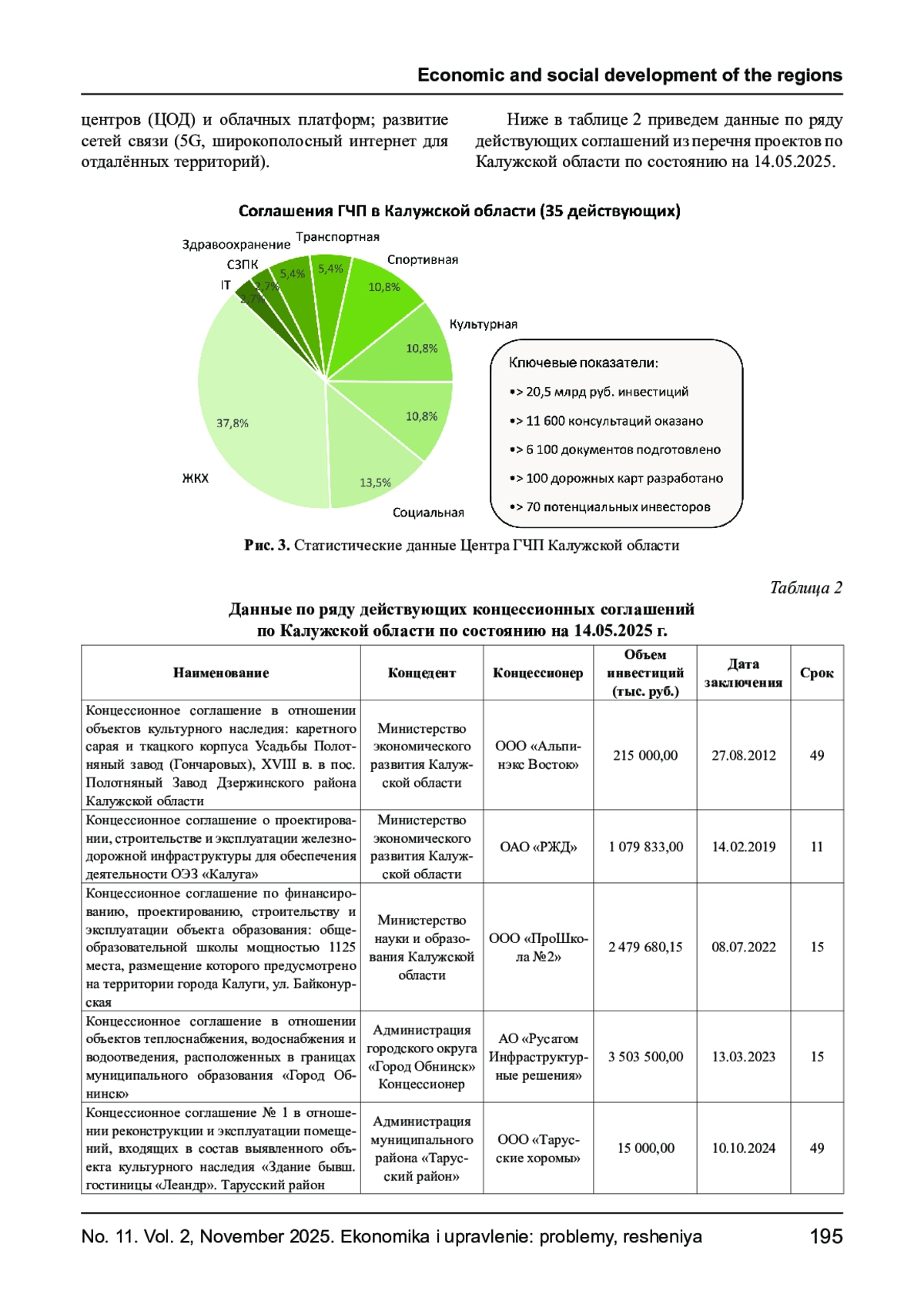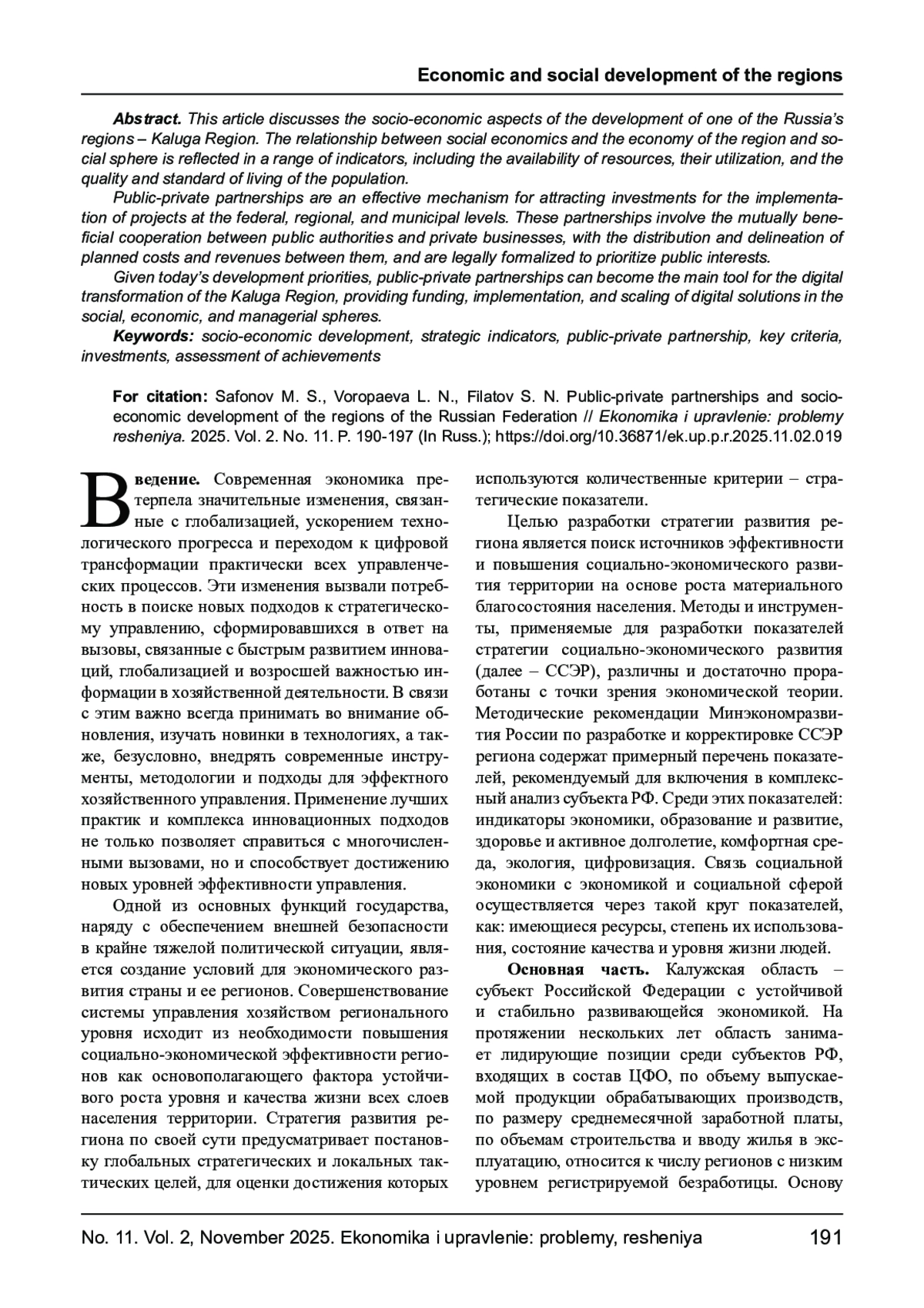 В данной статье рассмотрены социально-экономические аспекты развития одного из субъектов Российской Федерации - Калужской области. Связь социальной экономики с экономикой региона и социальной сферой осуществляется через такой круг показателей, как: имеющиеся ресурсы, степень их использования, состояние качества и уровня жизни людей. Эффективным механизмом привлечения инвестиций для реализации проектов федерального, а также регионального и муниципального уровней является государственно-частное партнерство - взаимовыгодное сотрудничество органов публичной власти и частного хозяйствующего субъекта с распределением и разграничением между ними планируемых издержек и доходов, юридически оформленное и обеспечивающее приоритет публичных интересов. С учетом сегодняшних приоритетов развития, государственно-частное партнерство может стать главным инструментом цифровой трансформации Калужской области, обеспечивая финансирование, внедрение и масштабирование цифровых решений в социальной, экономической и управленческой сферах.