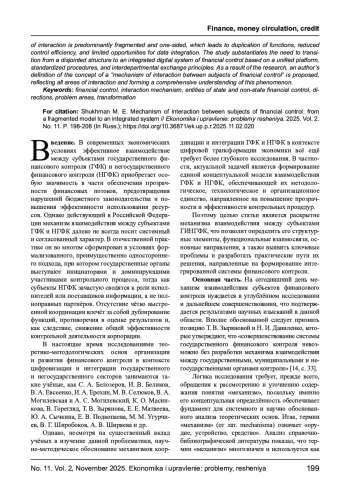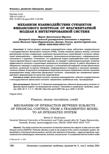 В статье раскрыт механизм взаимодействия между субъектами государственного и негосударственного финансового контроля (ГНФК). Особое внимание уделено анализу состояния действующей системы координации, выявлению функциональных взаимосвязей и основных направлений взаимодействия - нормативно-правового, организационно-методического, информационного, технического и кадрового. Установлено, что современная модель взаимодействия носит преимущественно фрагментарный и односторонний характер, что приводит к дублированию функций, снижению эффективности контроля и ограничивает возможности интеграции данных. В работе обоснована необходимость перехода от разрозненной структуры к интегрированной цифровой системе финансового контроля, основанной на единой платформе, унифицированных стандартах и принципах межведомственного обмена. В результате исследования предложено авторское определение понятия «механизм взаимодействия между субъектами финансового контроля», отражающее все направления взаимодействия и формирующее его целостное представление.