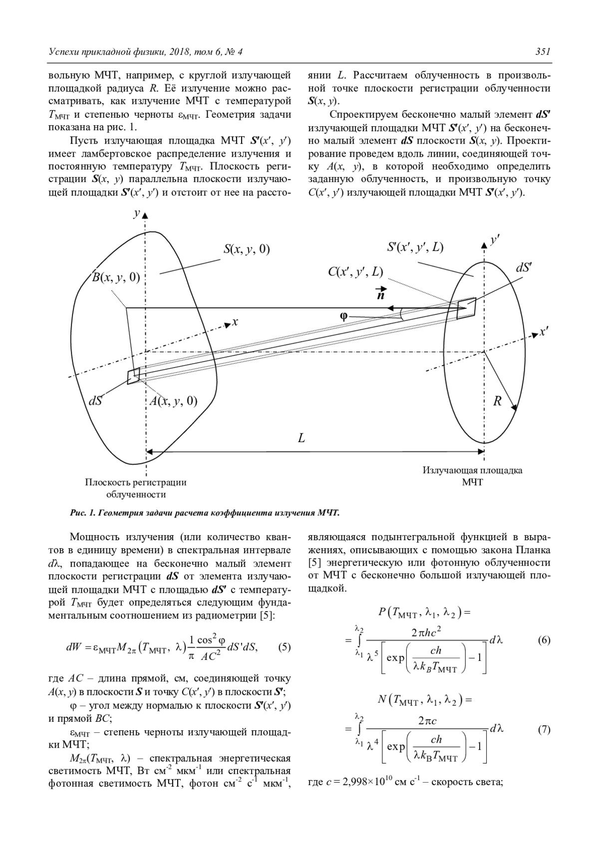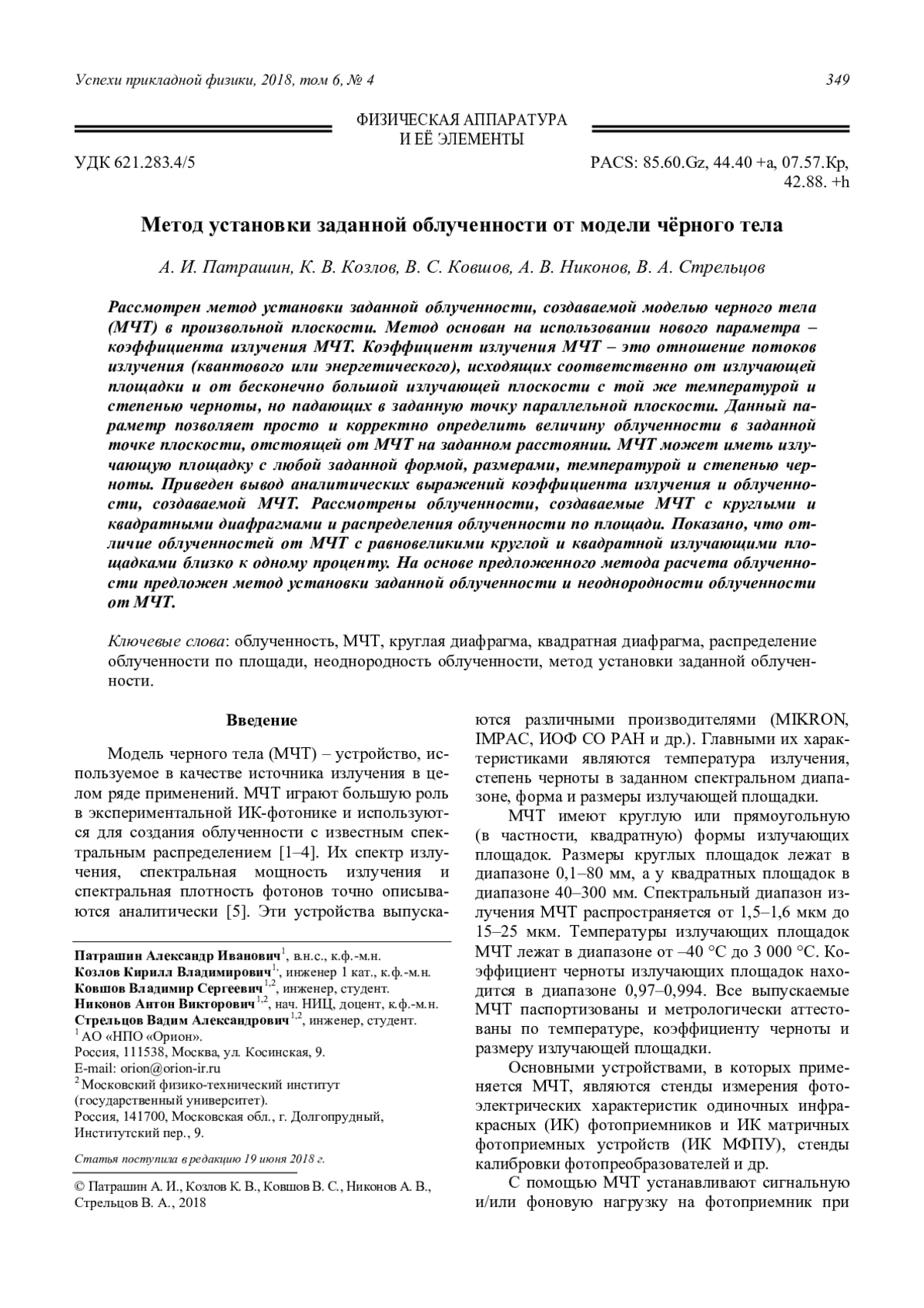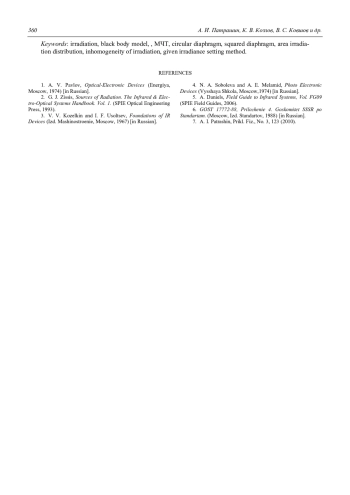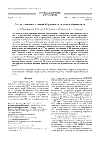 Рассмотрен метод установки заданной облученности, создаваемой моделью черного тела (МЧТ) в произвольной плоскости. Метод основан на использовании нового параметра – коэффициента излучения МЧТ. Коэффициент излучения МЧТ – это отношение потоков излучения (квантового или энергетического), исходящих соответственно от излучающей площадки и от бесконечно большой излучающей плоскости с той же температурой и степенью черноты, но падающих в заданную точку параллельной плоскости. Данный параметр позволяет просто и корректно определить величину облученности в заданной точке плоскости, отстоящей от МЧТ на заданном расстоянии. МЧТ может иметь излучающую площадку с любой заданной формой, размерами, температурой и степенью черноты. Приведен вывод аналитических выражений коэффициента излучения и облученности, создаваемой МЧТ. Рассмотрены облученности, создаваемые МЧТ с круглыми и квадратными диафрагмами и распределения облученности по площади. Показано, что отличие облученностей от МЧТ с равновеликими круглой и квадратной излучающими площадками близко к одному проценту. На основе предложенного метода расчета облученности предложен метод установки заданной облученности и неоднородности облученности от МЧТ.