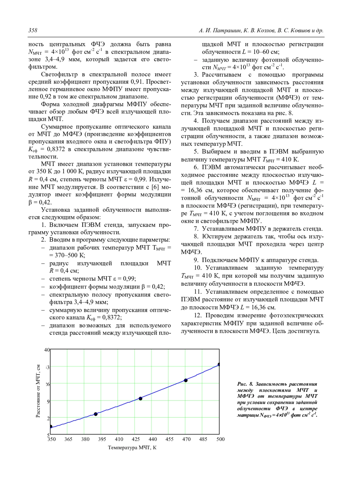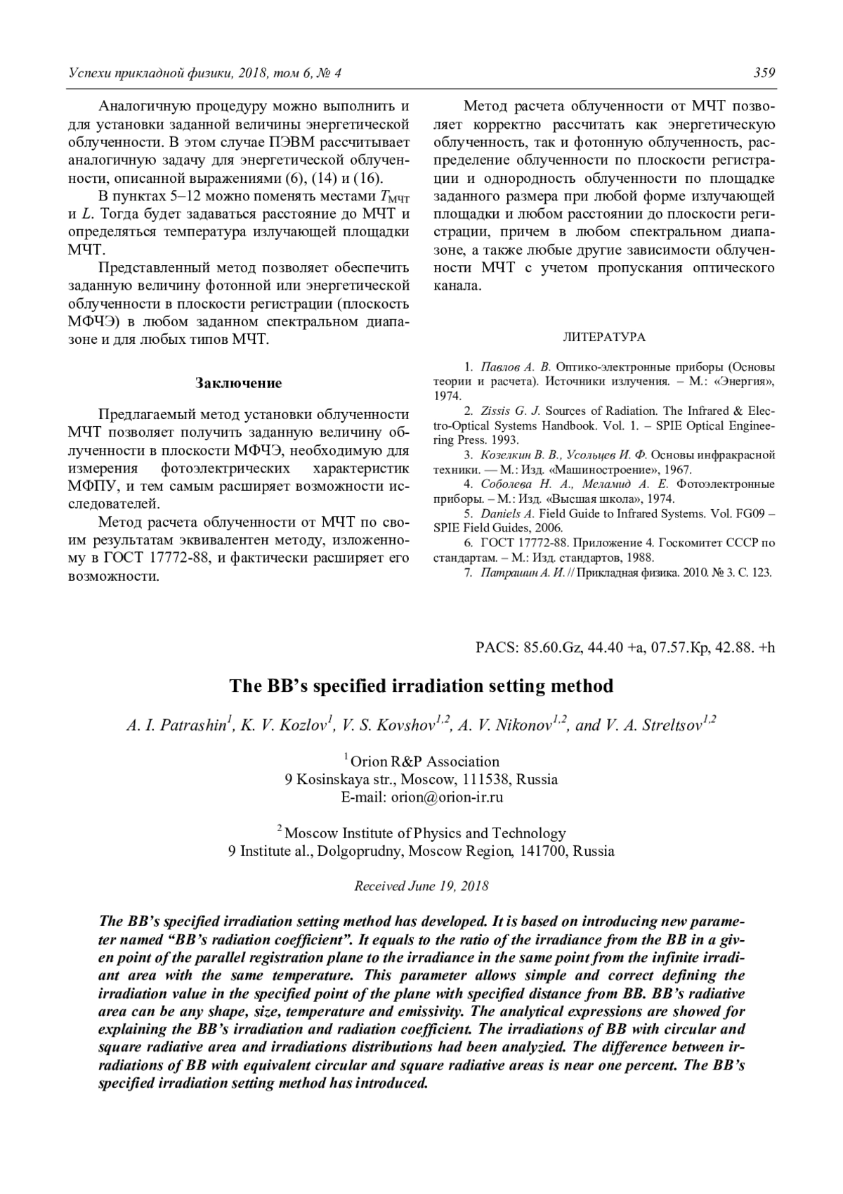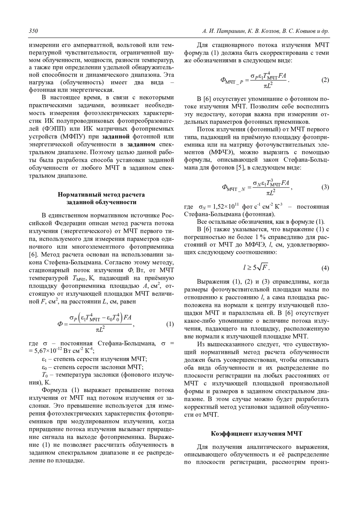Рассмотрен метод установки заданной облученности, создаваемой моделью черного тела (МЧТ) в произвольной плоскости. Метод основан на использовании нового параметра – коэффициента излучения МЧТ. Коэффициент излучения МЧТ – это отношение потоков излучения (квантового или энергетического), исходящих соответственно от излучающей площадки и от бесконечно большой излучающей плоскости с той же температурой и степенью черноты, но падающих в заданную точку параллельной плоскости. Данный параметр позволяет просто и корректно определить величину облученности в заданной точке плоскости, отстоящей от МЧТ на заданном расстоянии. МЧТ может иметь излучающую площадку с любой заданной формой, размерами, температурой и степенью черноты. Приведен вывод аналитических выражений коэффициента излучения и облученности, создаваемой МЧТ. Рассмотрены облученности, создаваемые МЧТ с круглыми и квадратными диафрагмами и распределения облученности по площади. Показано, что отличие облученностей от МЧТ с равновеликими круглой и квадратной излучающими площадками близко к одному проценту. На основе предложенного метода расчета облученности предложен метод установки заданной облученности и неоднородности облученности от МЧТ.