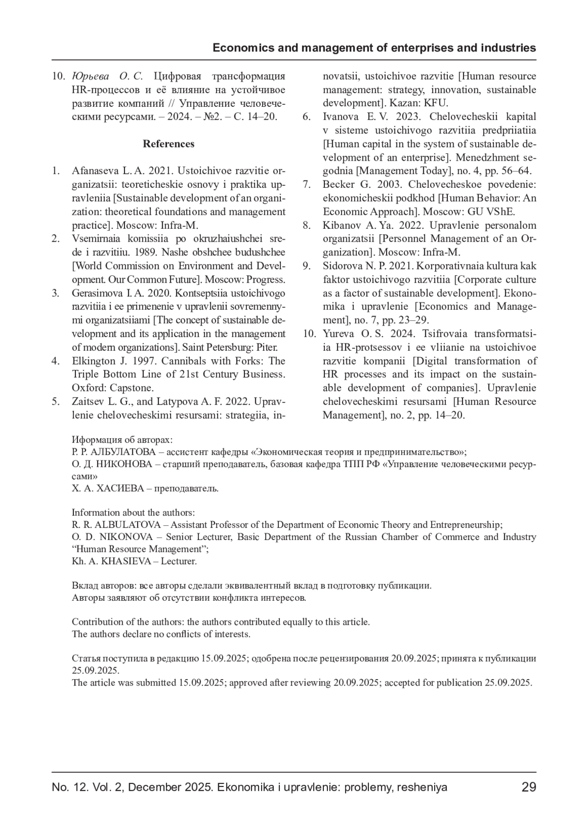 В статье исследуется роль человеческих ресурсов как стратегического фактора, обеспечивающего устойчивое развитие организации, которое рассматривается как гармоничное сочетание экономической эффективности, социальной ответственности и экологической ориентированности. Показано, что человеческий капитал включает не только знания и навыки сотрудников, но и ценностные установки, инновационный потенциал и способность к адаптации, что делает его ключевым элементом долгосрочной конкурентоспособности предприятия. Рассматриваются современные подходы к управлению человеческими ресурсами, ориентированные на стратегическую интеграцию HR-процессов с корпоративной стратегией устойчивого развития, а также роль корпоративной культуры и инновационной активности персонала в обеспечении устойчивости организации. Сделан вывод о том, что эффективное управление человеческими ресурсами выступает инструментом гармонизации интересов сотрудников, общества и бизнеса, способствуя формированию условий для инновационного развития и долгосрочной стабильности организации.