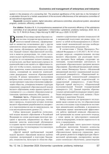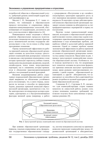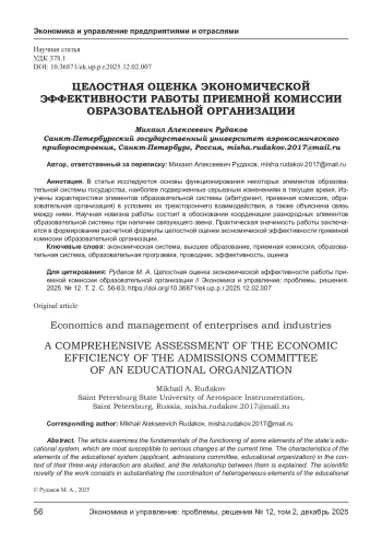 В статье исследуются основы функционирования некоторых элементов образовательной системы государства, наиболее подверженные серьезным изменениям в текущее время. Изучены характеристики элементов образовательной системы (абитуриент, приемная комиссия, образовательная организация) в условиях их трехстороннего взаимодействия, а также объяснена связь между ними. Научная новизна работы состоит в обосновании координации разнородных элементов образовательной системы при наличии связующего звена. Практическая значимость работы заключается в формировании расчетной формулы целостной оценки экономической эффективности приемной комиссии образовательной организации.