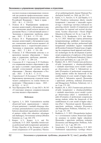 8. Сенашенко В. С. Стручкова Е. П. Особенности сопряжения высшего образования и сферы труда в условиях структурных преобразований отечественной системы высшего образования // Высшее образование в России. - 2025. - Т. 34, № 3. - С. 31-51.