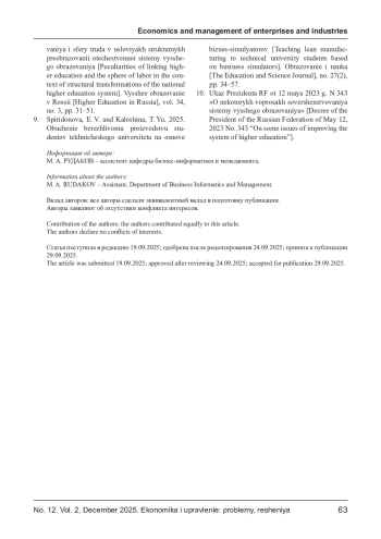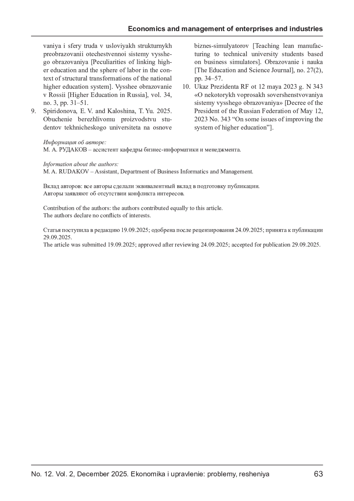 9. Спиридонова Е. В. Калошина Т. Ю. Обучение бережливому производству студентов технического университета на основе бизнес-симуляторов // Образование и наука. - 2025. - № 27(2). - С. 34-57.