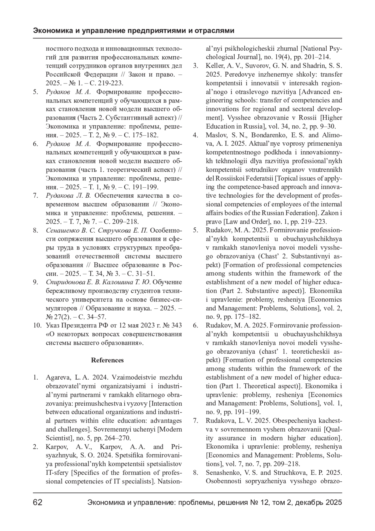 5. Рудаков М. А. Формирование профессиональных компетенций у обучающихся в рамках становления новой модели высшего образования (Часть 2. Субстантивный аспект) // Экономика и управление: проблемы, решения. - 2025. - Т. 2, № 9. - С. 175-182.