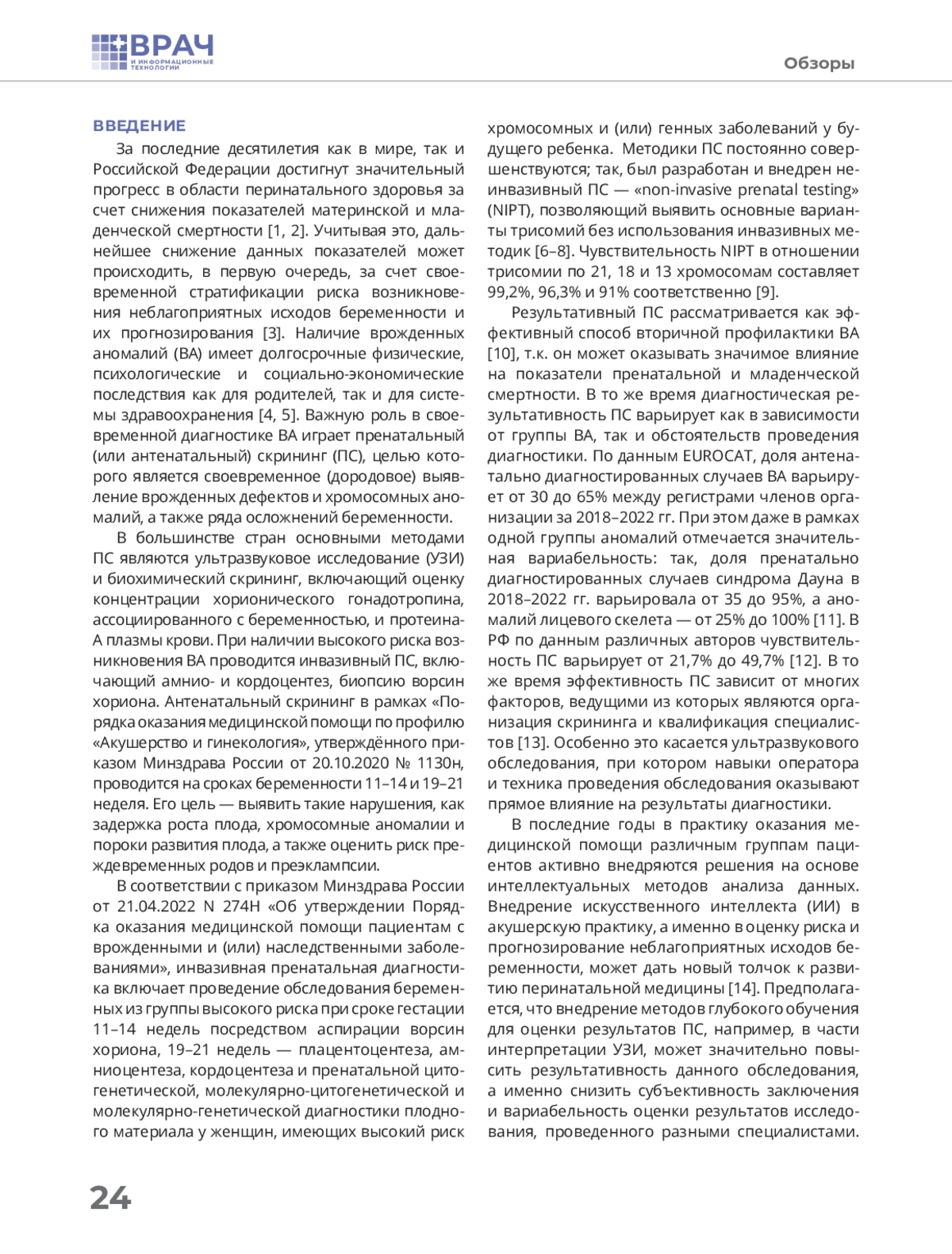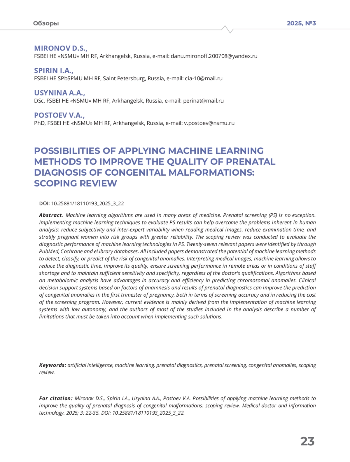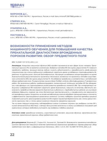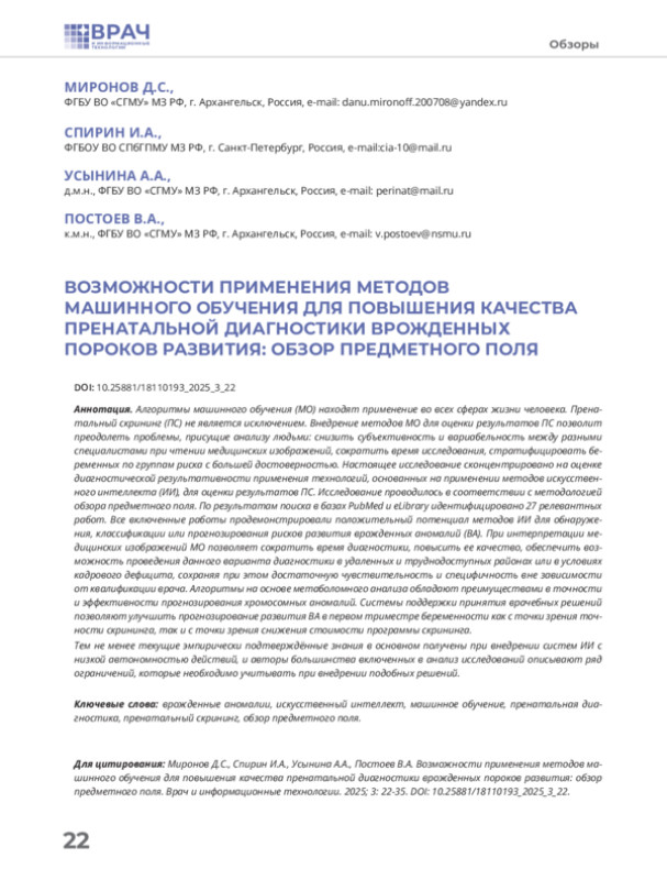 Алгоритмы машинного обучения (МО) находят применение во всех сферах жизни человека. Пренатальный скрининг (ПС) не является исключением. Внедрение методов МО для оценки результатов ПС позволит преодолеть проблемы, присущие анализу людьми: снизить субъективность и вариабельность между разными специалистами при чтении медицинских изображений, сократить время исследования, стратифицировать беременных по группам риска с большей достоверностью. Настоящее исследование сконцентрировано на оценке диагностической результативности применения технологий, основанных на применении методов искусственного интеллекта (ИИ), для оценки результатов ПС. Исследование проводилось в соответствии с методологией обзора предметного поля. По результатам поиска в базах PubMed и eLibrary идентифицировано 27 релевантных работ. Все включенные работы продемонстрировали положительный потенциал методов ИИ для обнаружения, классификации или прогнозирования рисков развития врожденных аномалий (ВА). При интерпретации медицинских изображений МО позволяет сократить время диагностики, повысить ее качество, обеспечить возможность проведения данного варианта диагностики в удаленных и труднодоступных районах или в условиях кадрового дефицита, сохраняя при этом достаточную чувствительность и специфичность вне зависимости от квалификации врача. Алгоритмы на основе метаболомного анализа обладают преимуществами в точности и эффективности прогнозирования хромосомных аномалий. Системы поддержки принятия врачебных решений позволяют улучшить прогнозирование развития ВА в первом триместре беременности как с точки зрения точности скрининга, так и с точки зрения снижения стоимости программы скрининга.
