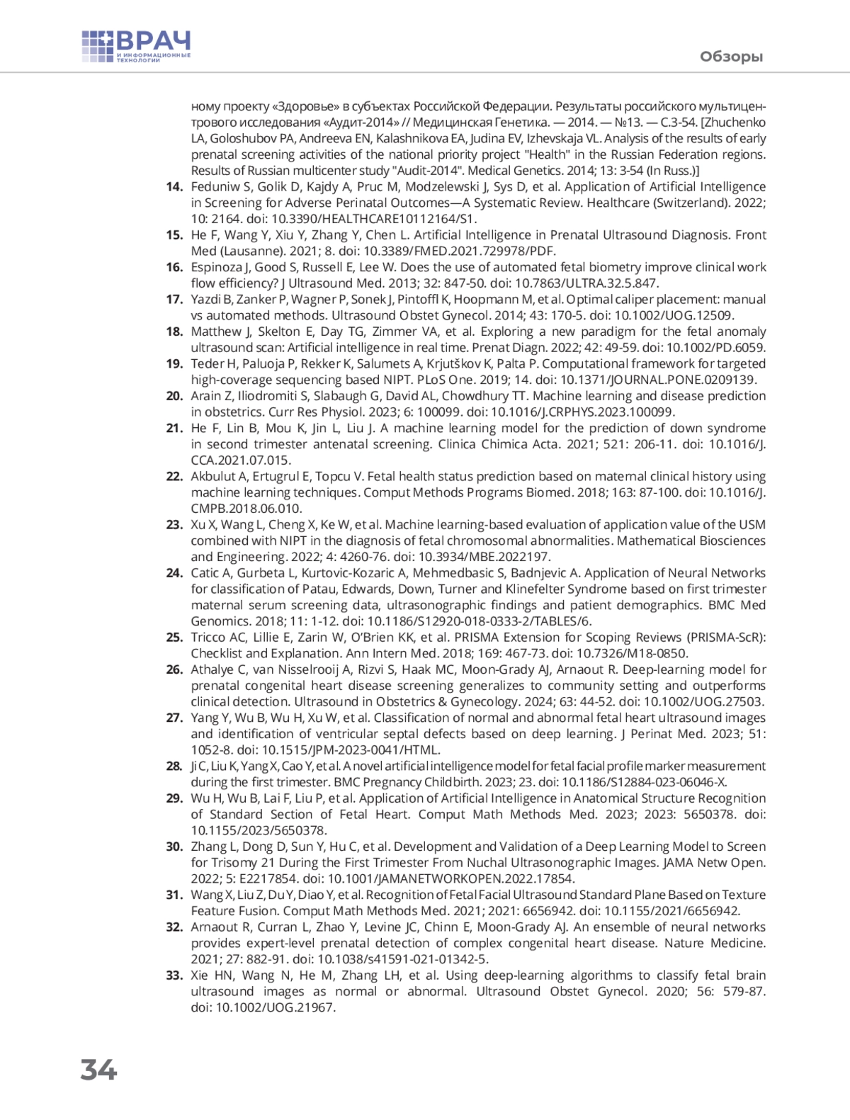 35. Lin M, Zhou Q, Lei T, Shang N, et al. Deep learning system improved detection efficacy of fetal intracranial malformations in a randomized controlled trial. NPJ Digit Med. 2023; 6: 191. DOI: 10.1038/S41746-023-00932-6 EDN: OXFNWS
